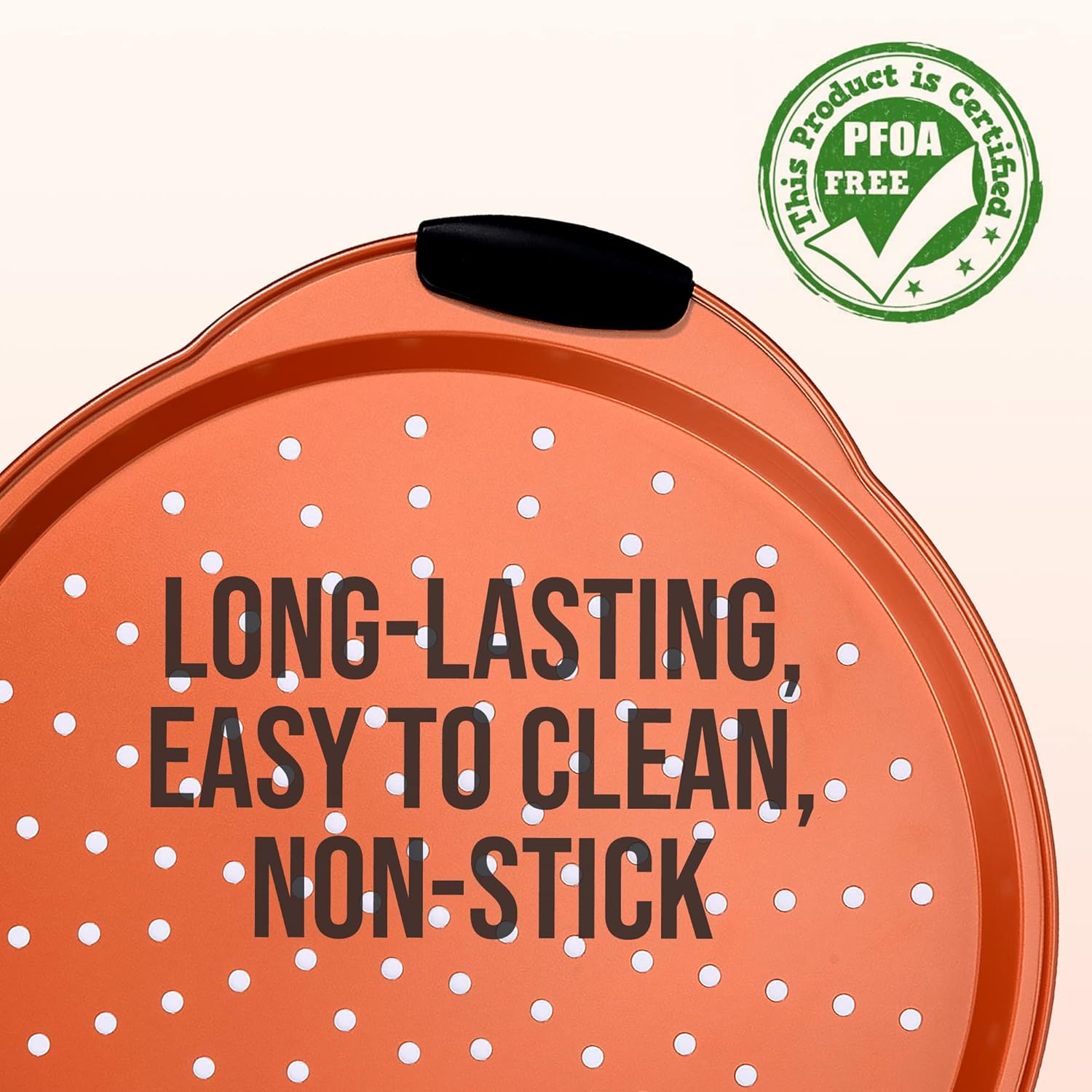 NutriChef 13-Inch Nonstick Pizza Tray - Round Carbon Steel Non-Stick Pizza Baking Pan with Perforated Holes, Premium Bakeware Pizza Screen with Silicone Grip Handles, Dishwasher Safe - Copper