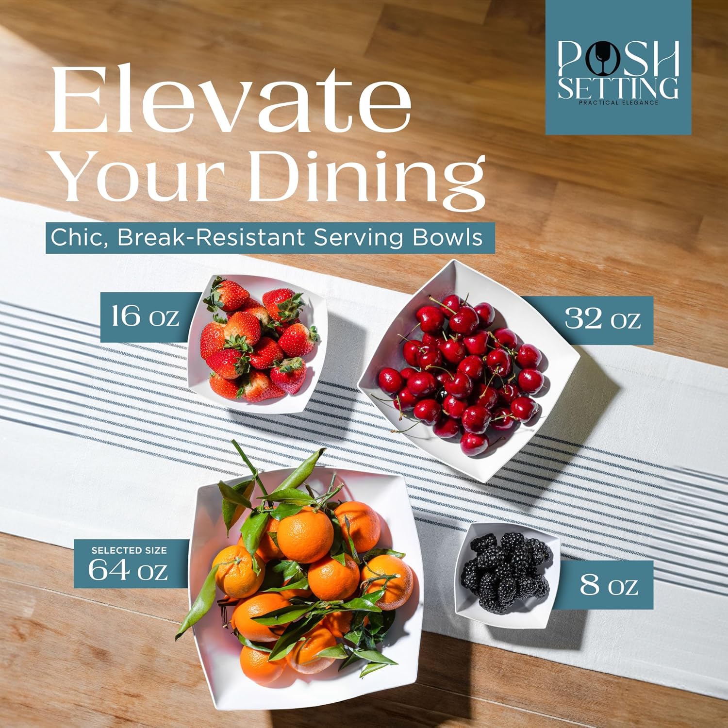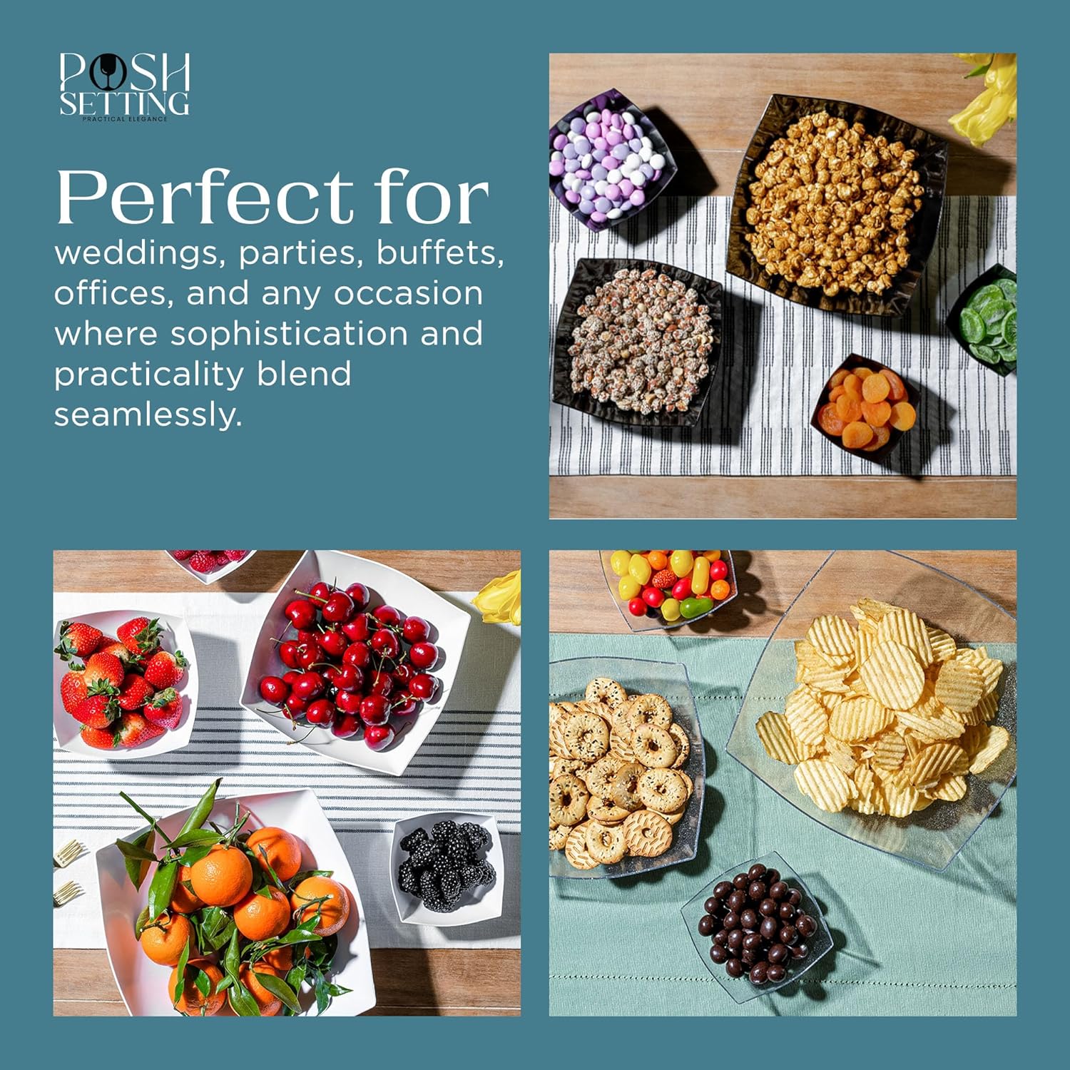 Posh Setting White Plastic Serving Bowls Disposable - Square Bowls - Square Candy Bowl - Plastic Snacks & Chip Bowls for Parties - White, Gold & Clear, Black Serving Dishes, 64 OZ, 4 Pack
