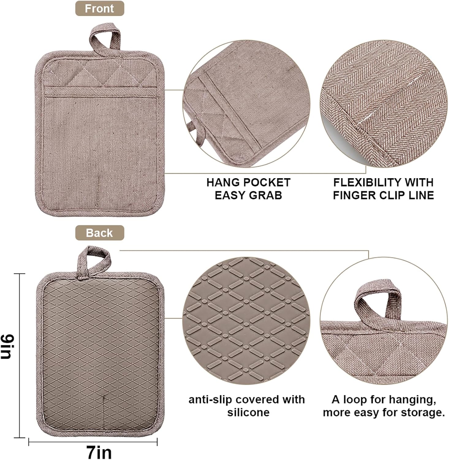 Pot Holders Yarn-Dyed Set of 3 Non Slip Silicone Kitchen Lines Heat Resistant 500℉ Kitchen Gloves BBQ Cooking Baking Cooking Barbecue Microwave Machine Washable (Khaki Pot Holders)