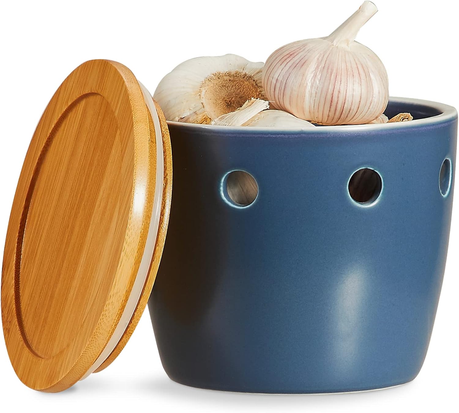 ONEMORE Large Garlic Keeper with Lid, Ceramic Garlic Saver 5 inch, Garlic Keeper for Counter, Blue