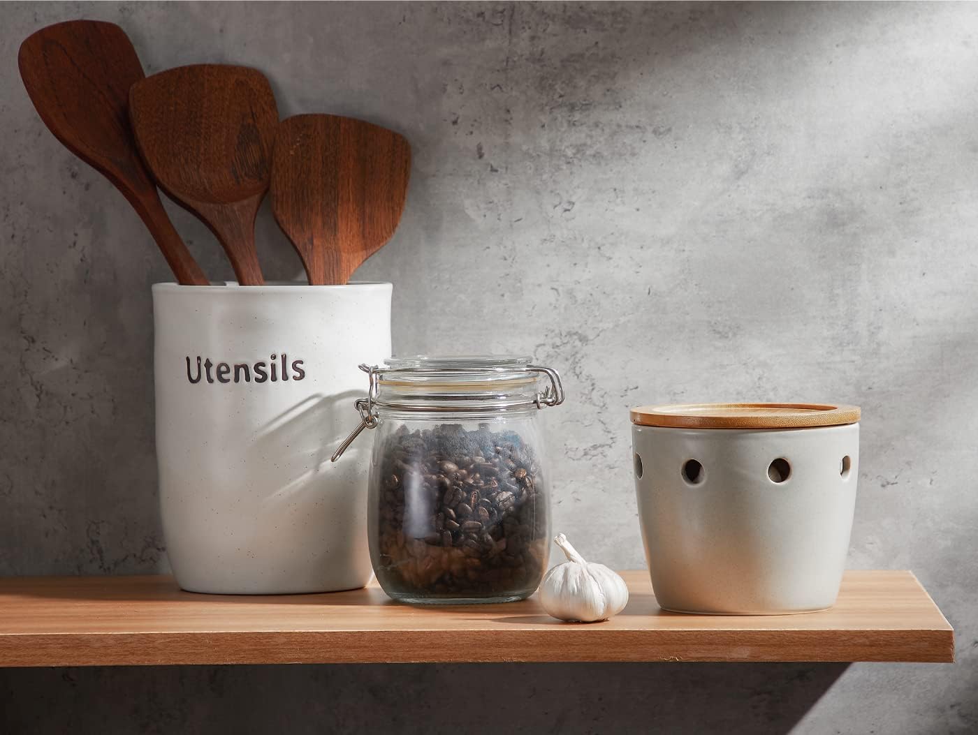- 【Nice Addition for Countertop】: The simple rustic farmhouse style garlic keeper goes well with your kitchen counter, finished with a glossy surface and edges, making it easy to clean up.