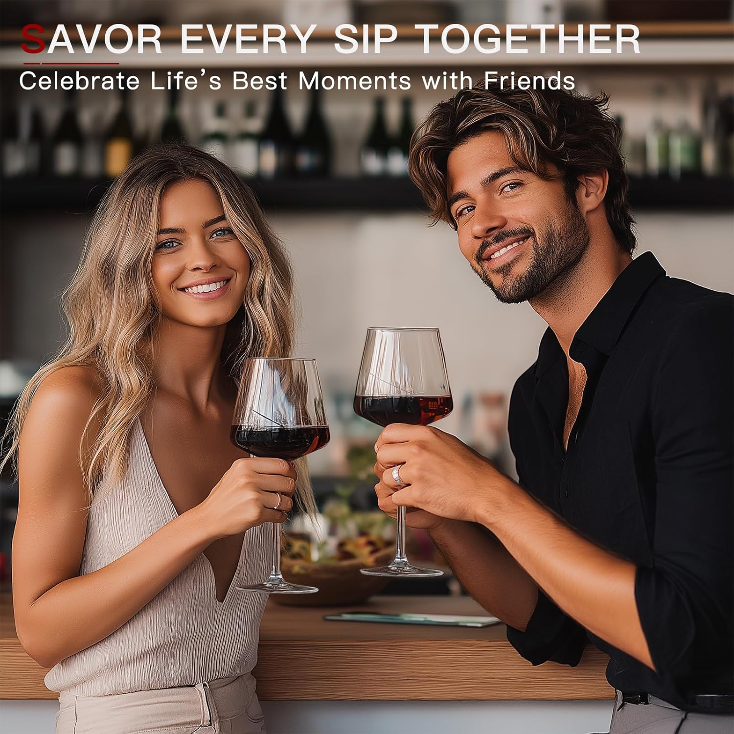 - 【Lead-free Crystal Wine Glasses】Thanks to premium crystal,making the wine glasses set of 6 has a thin rim,sparkly personality and incredible brightness that has a beautifully presented.All the crystal stemware tempered for durability , promotes optimal wine presentation to perfectly savor Pinot Noir, Bordeaux, Cabernet Sauvignon, or Chardonnay, a delightful sound when clinked for a toast, and enjoyable sipping when relaxing after work or socializing with friends.
