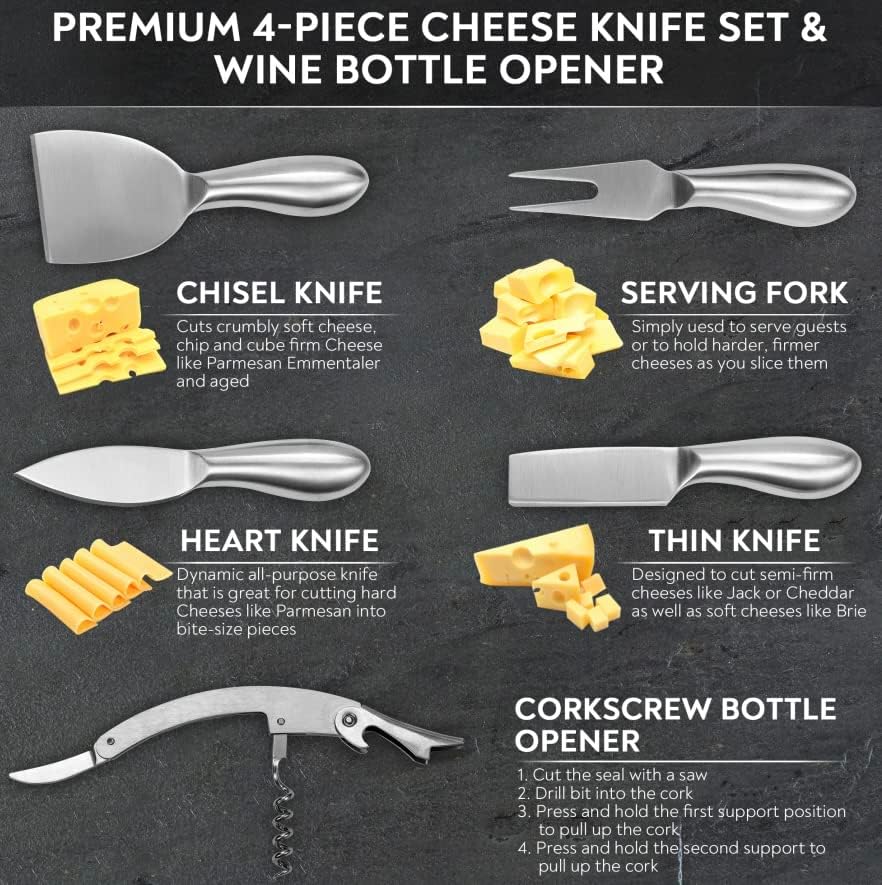 - 🍴 Includes Must-Have Charcuterie Accessories: Unlike most resin/olive wood trays, our cheese and meat cutting board comes with all the utensils you'll need: 2 dip bowls, 1 wine corkscrew, plus 1 cheese knife set for charcuterie board with 4 sterling-silver knives; You even get a printed full-color guide to gourmet wines and cheeses