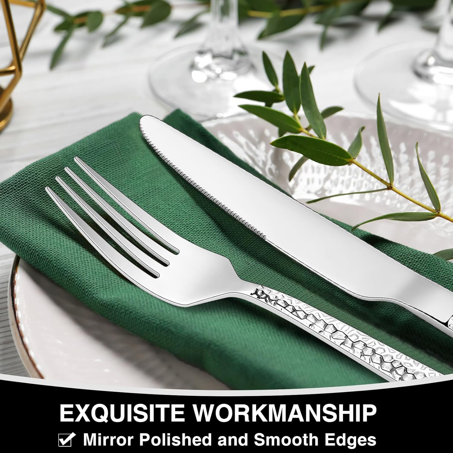 Hammered Silverware Set, 40-Piece Stainless Steel Square Flatware Set for 8, Food-Grade Tableware Cutlery Set, Utensil Sets for Home Restaurant, Mirror Finish, Dishwasher Safe
