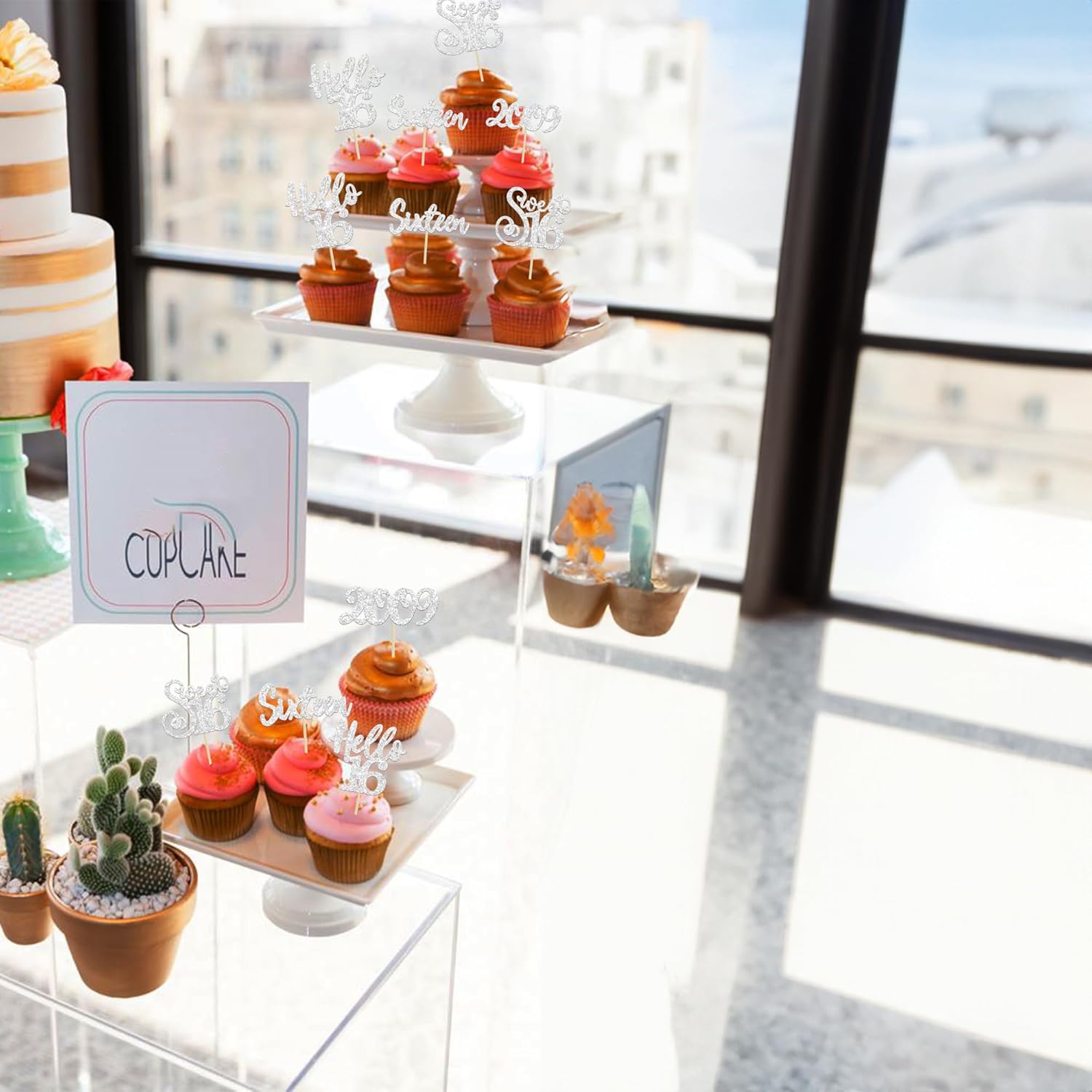 Gyufise 24Pcs 16th Birthday Cupcake Toppers Silver Glitter Hello 16 Sweet 16 Cupcake Picks 2009 16th Birthday Cake Decorations for Celebrating 16th Birthday Anniversary Party Supplies