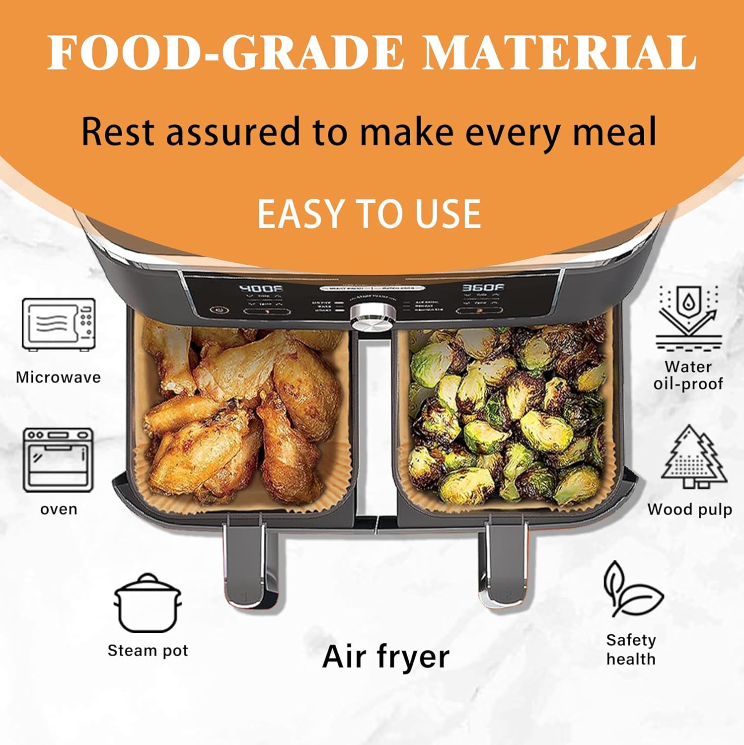 - 🌡【Food grade material】PADIMAT air fryer liner is made of food-grade, high-quality material that is waterproof, oil-proof, non-stick, and can be heat-resistant up to 428°F. It does not affect the taste of the food itself and keeps the shape and taste of the food.