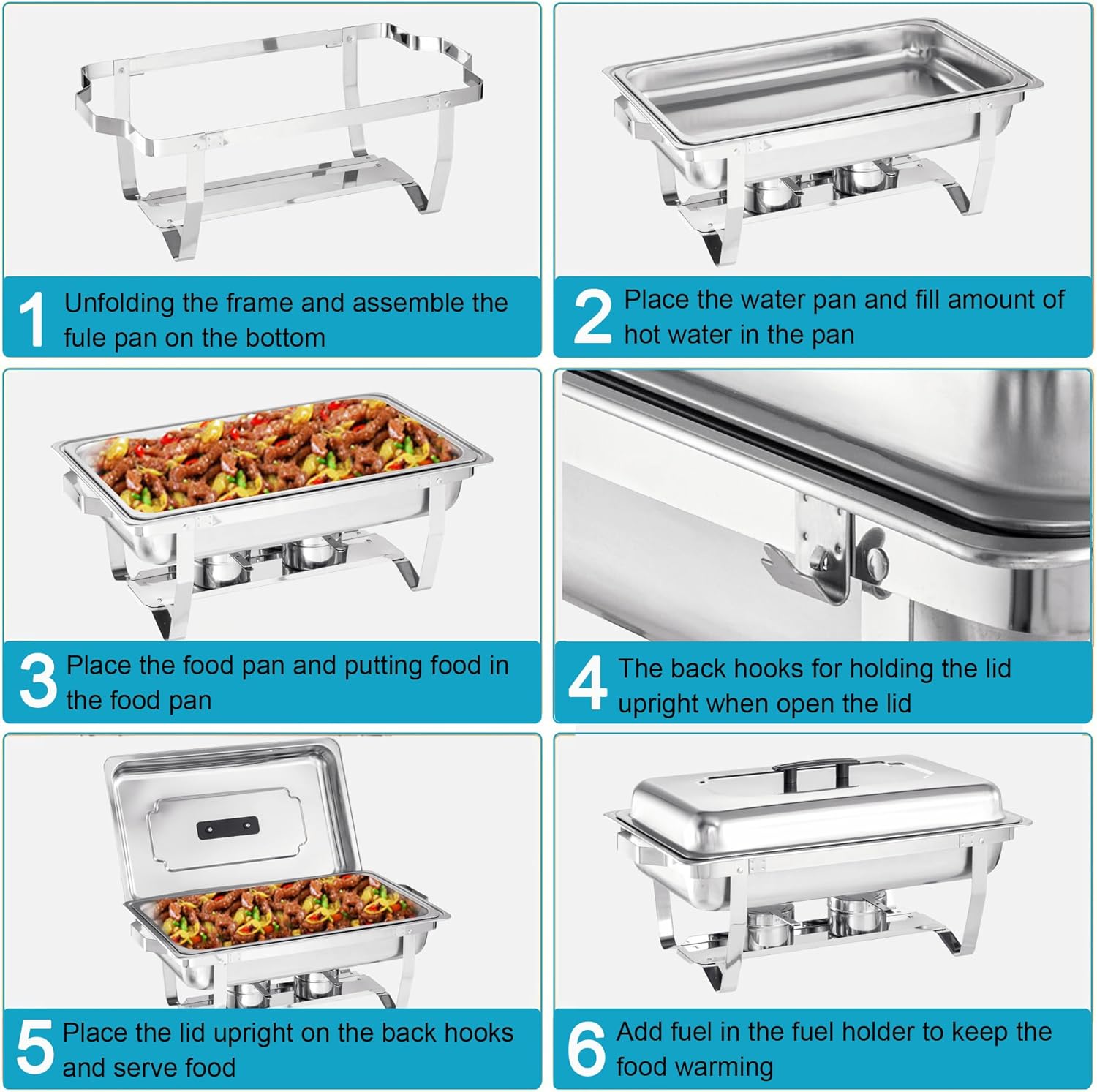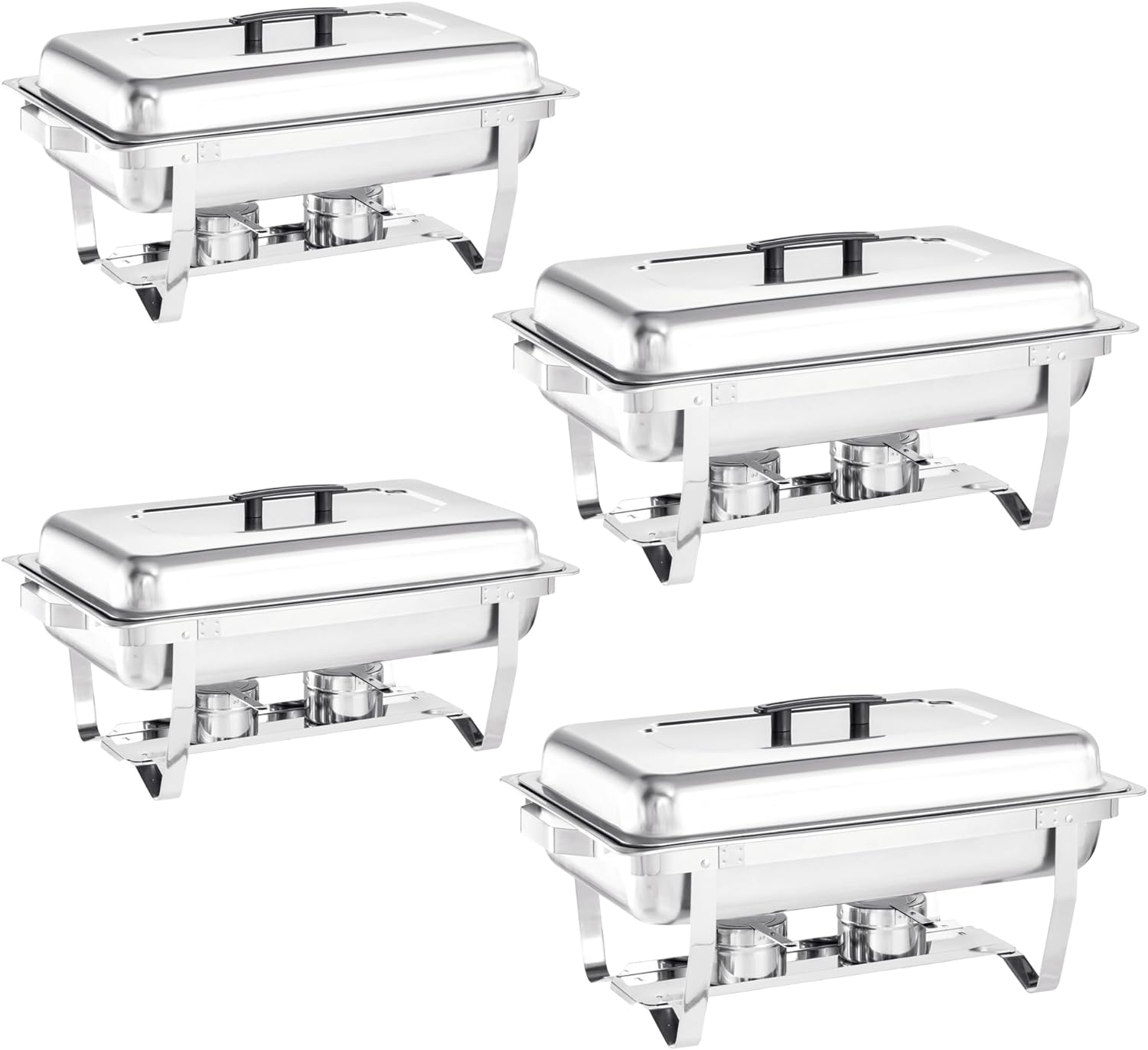 - 【CHAFING DISHES】 - 4 Pack Chafing Dish Buffet Set Chafers 8Q.Each chafing dish comes with 2 fuel holders, frame, small tray, large tray pan tray, and lid. Chafing dish has a Stainless Steel, frame As well as a heavy duty handle that supports its 8 quart tray to ensure that the product can be moved with ease.The flipped edge process greatly reduces the risk of injury from edges and reduces damage during shipment. There are two cool handles for easy movement during use.