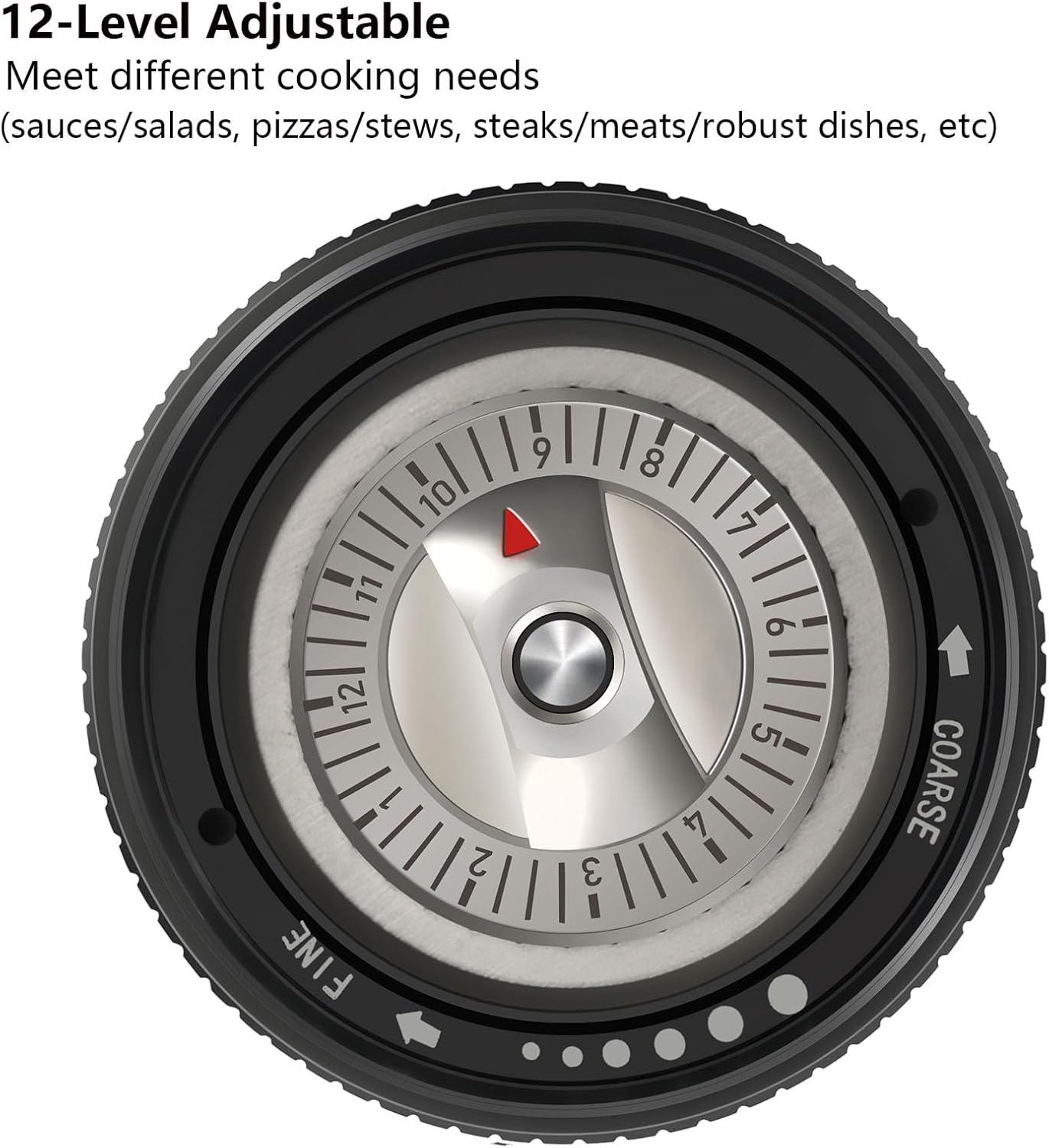 - [Adjustable Coarseness for Culinary Precision]: Tailor spice textures from coarse rubs (6-grit) to ultra-fine powder (60+ grit) with the adjustable pepper mill. Ideal for seared meats, salads, or baking with spice mill versatility.