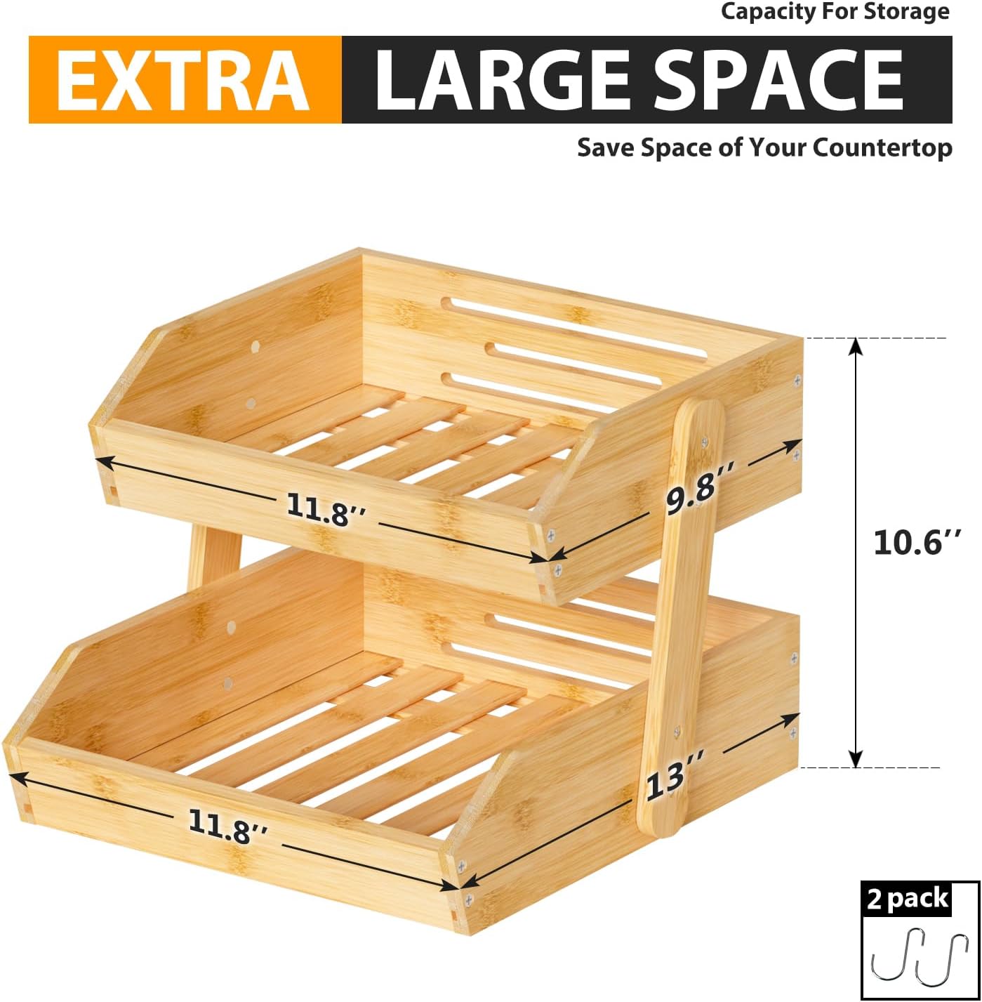 - SUFFICIENT STORAGE SPACE: 2 Bamboo fruit baskets of different sizes are used to meet different storage needs (each basket can be used separately). Plus two detachable hooks for extra storage.