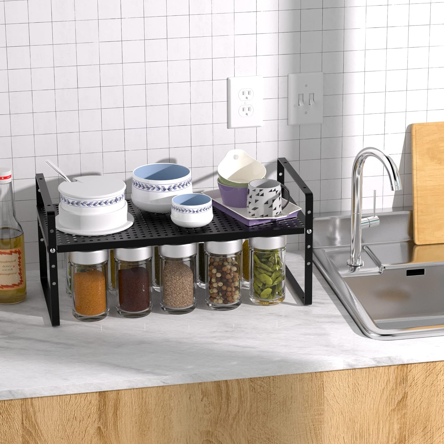 - 【Expandable and stackable design】--The Adjustable Countertop Organizer (collapsed) measures 16.5" L x 10.2" W x 9.8" H, expands from 16.5" to 27.5" wide. You can also stack two shelves together to create a two-tier storage space.