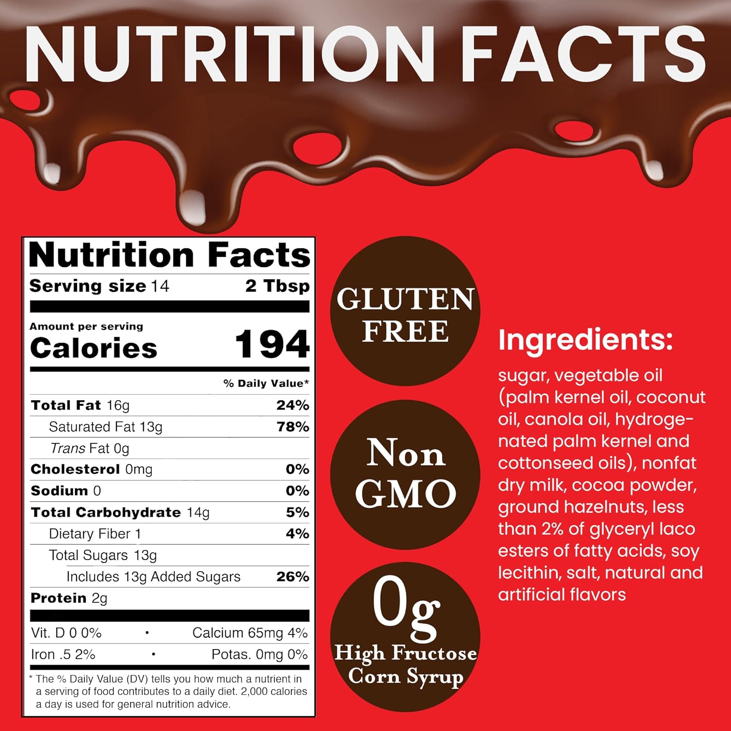 - INGREDIENTS: Sugar, vegetable oil (palm kernel oil, coconut oil, canola oil, hydroge- nated palm kernel & cottonseed oils), nonfat dry milk, cocoa powder, ground hazelnuts, less than 2% of glyceryl laco esters of fatty acids, soy lecithin, salt, natural & artificial flavors