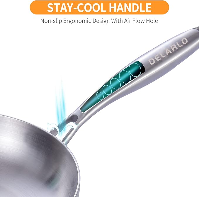 - 【Practical and Elegance】Delarlo Tri-Ply Stainless Steel Pan Combines Ergonomic cookware Design and superior features for optimal cooking performance. The rounded and encapsulated rim for drip free pouring and easy transfers,Rivet-free surface to eliminate food traps