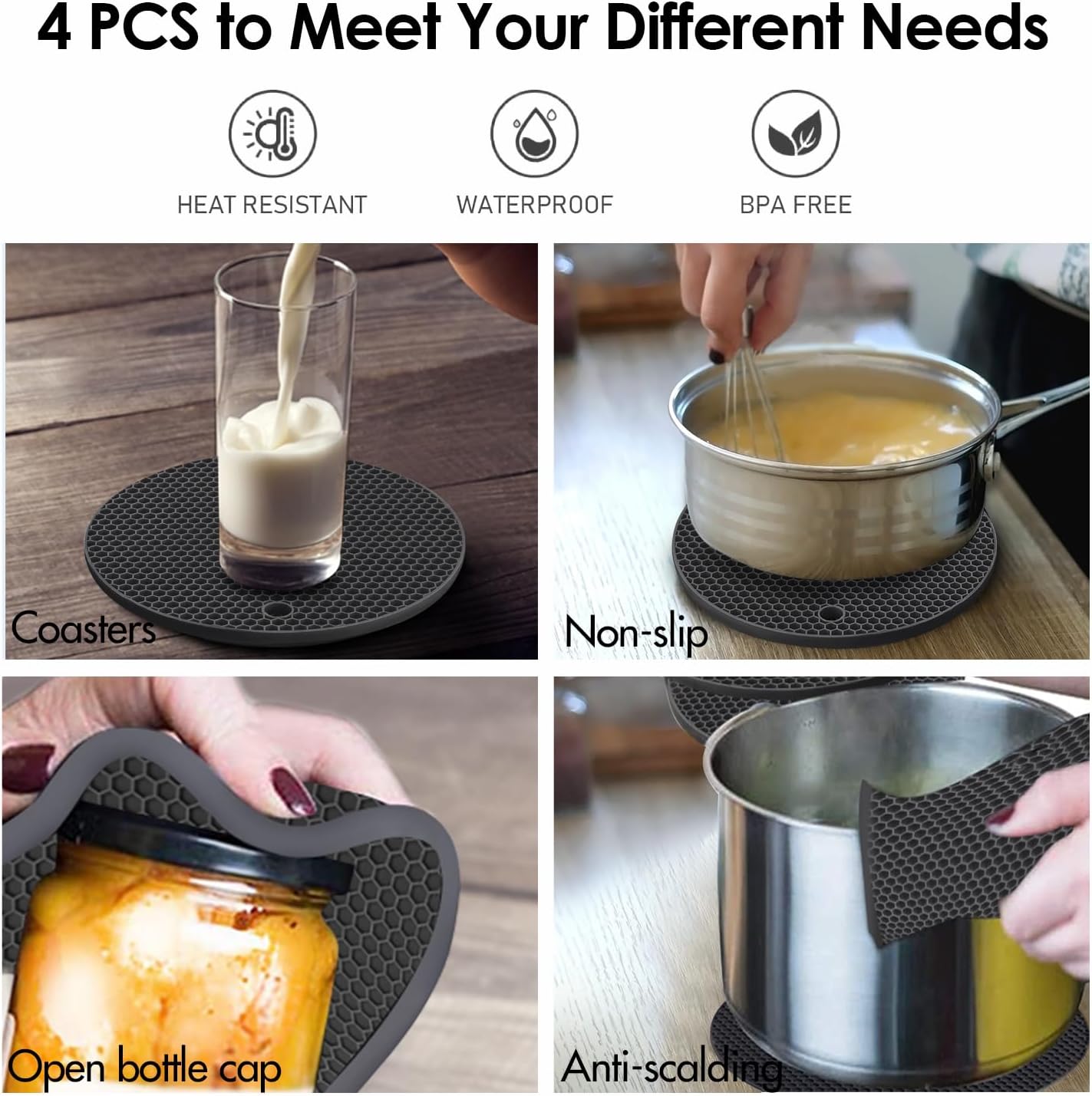 Silicone Trivets for Hot Pots and Pans, 0.31" Thick Trivet Mat for Hot Dishes Set of 4, Heat Resistant Durable Flexible Silicone Mat Pot Mat for Countertop, Easy to Wash and Dry, Dark Gray