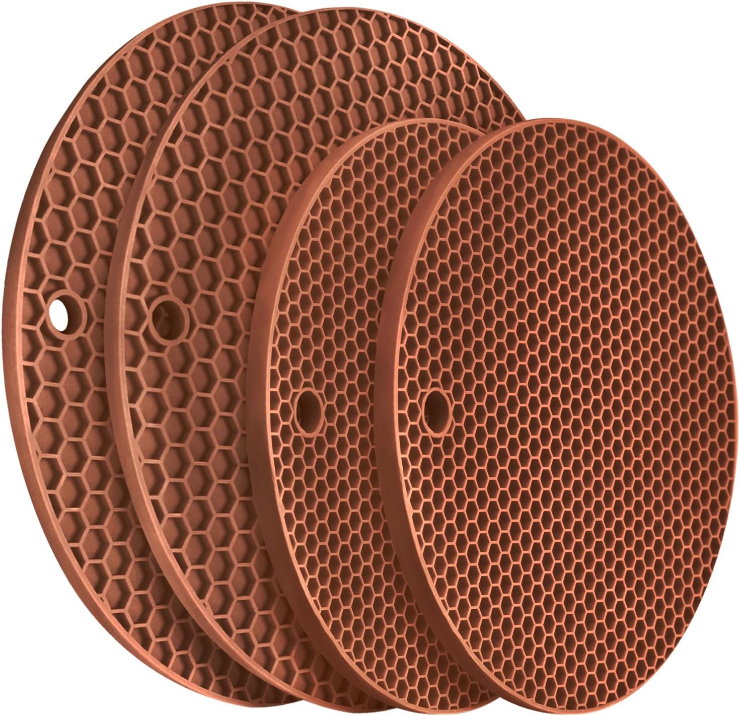 - 🎯 MULTIFUNCTIONAL TRIVETS - A must-have kitchen accessory. Save the valued kitchen space easily, each silicone trivet has a corner hole for convenient hanging storage and can use as a hot pad for countertops, spoon rest, utensil rest, small dish drying mat, Jar opener, silicone table mat, silicone coaster, garlic peeler, and brown hot pot holder.