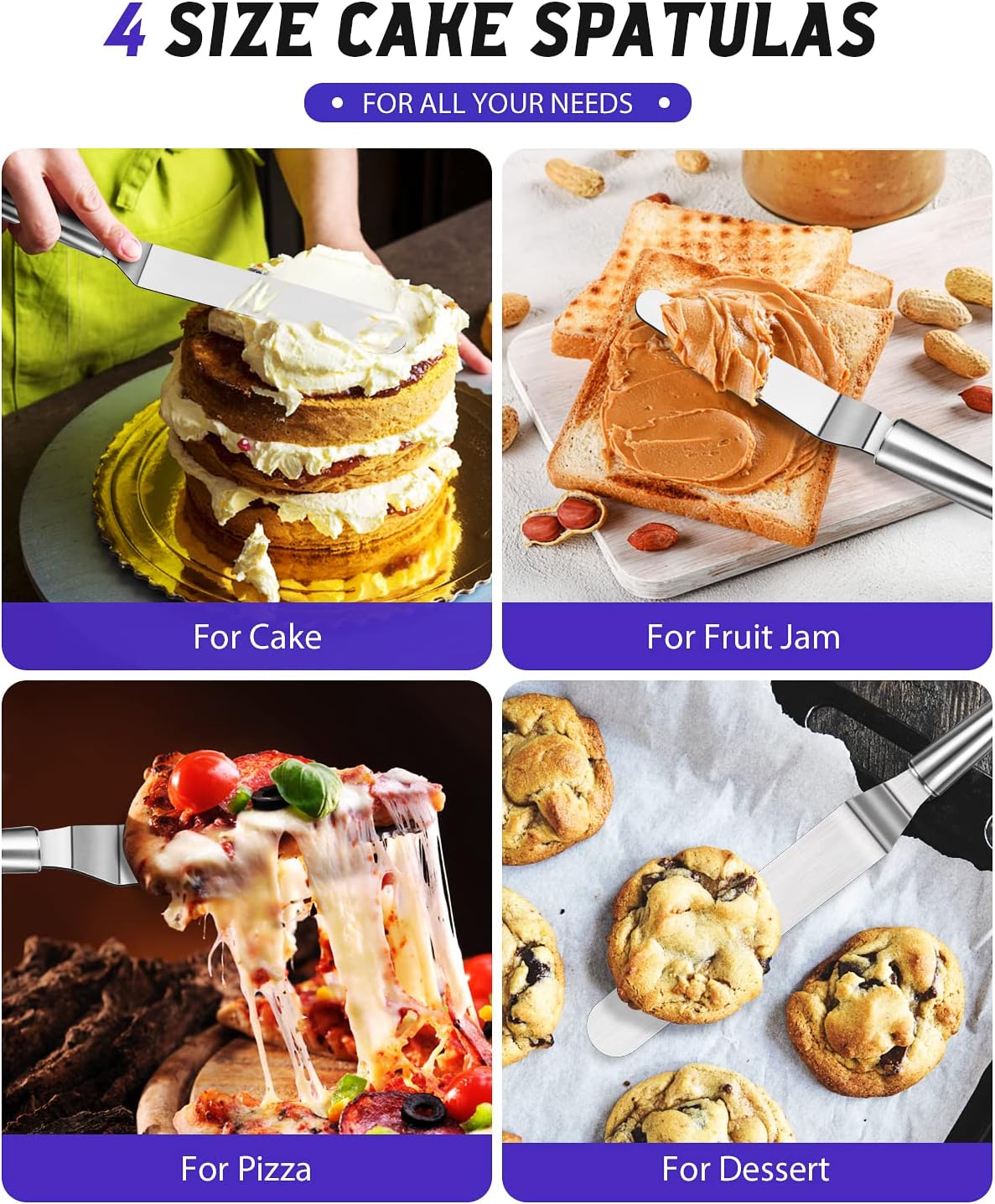 - MULTIPURPOSE: 4, 6, 8 and 10 inches offset spatulas can help you in a lot of ways, such as frosting cake, desserts, cupcakes, biscuits, cheese, pancakes, pies, bread, chocolate etc. So, this icing spatula set is an essential cake decorating tool. Please believe me, every family needs them