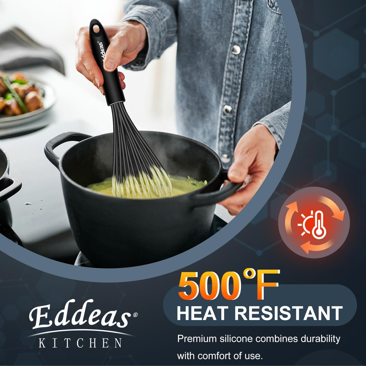 - FOOD GRADE SILICONE - Eddeas Silicone Whisk are made with food grade silicone wrapped with high quality steel wire, which solves the problem of friction between kitchenware and damage to the non-stick coating, Whisks for cooking protects your non-stick cookware, plus the built-in The steel wire, which provides strong support when stirring, wisking tools is the first choice in the kitchen.