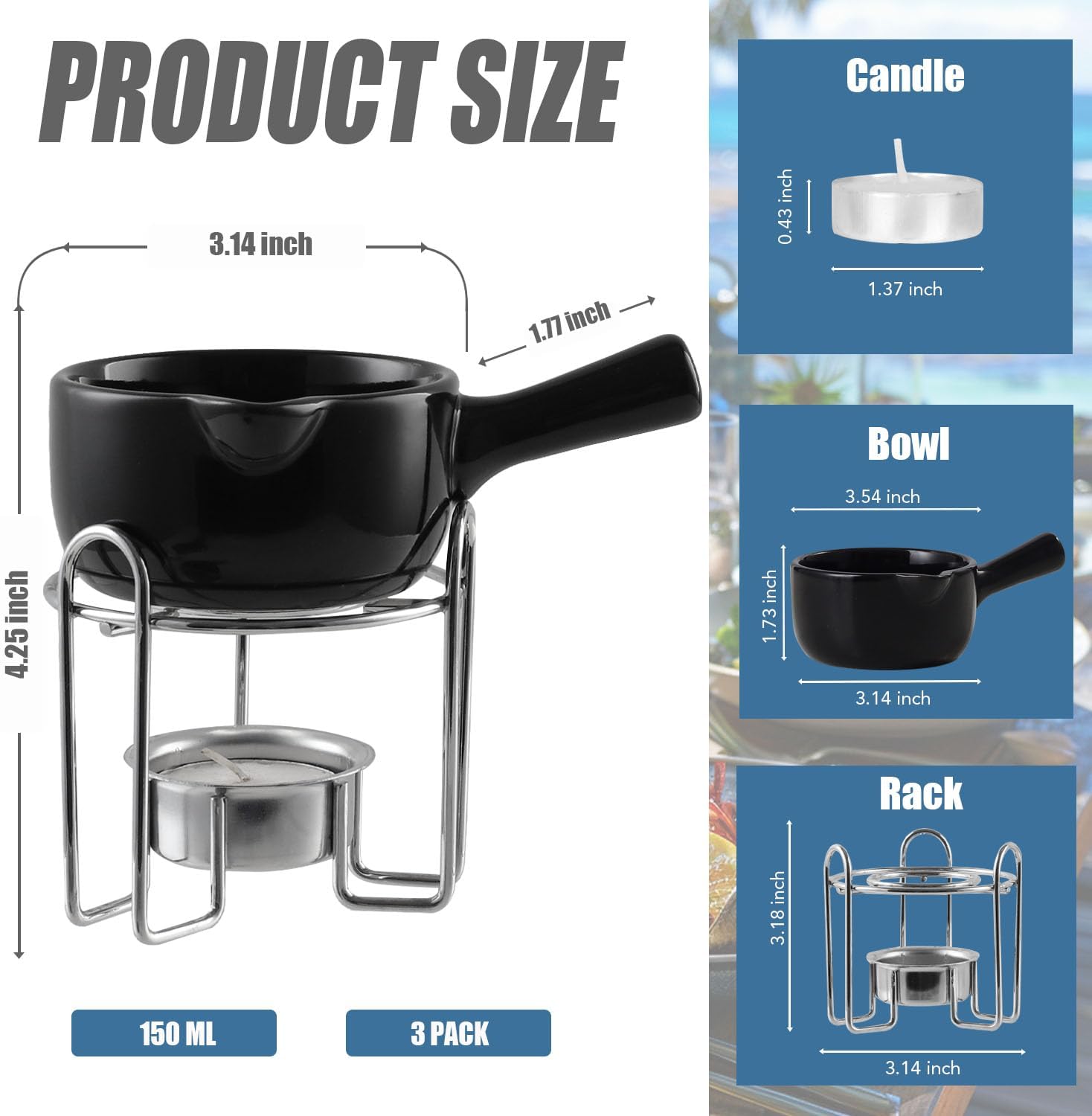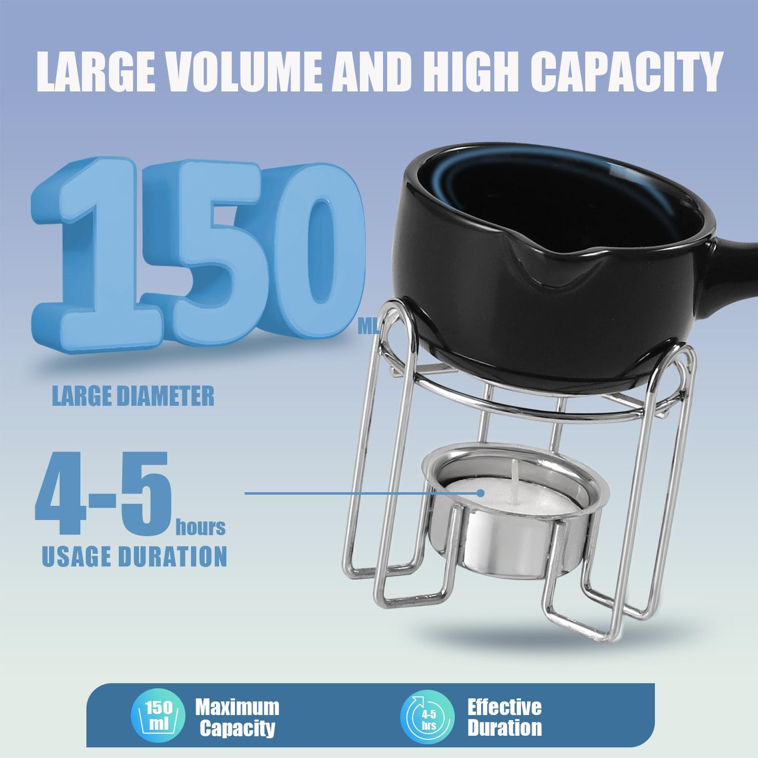 - BIGGER CAPACITY - Our butter warmers have an adequate capacity of approximately 5.1 oz/ 150 ml, large enough to hold a decent amount of anything, making them a nice portion for lobster crab. The candles and metal stands have the ideal dimensions, about 1.37 x 0.43 inches for the candles, and about 3.14 x 3.18 inches for the stands, offering a practical and compact design, durable for long-term use. Fancy enough to use on any occasion!