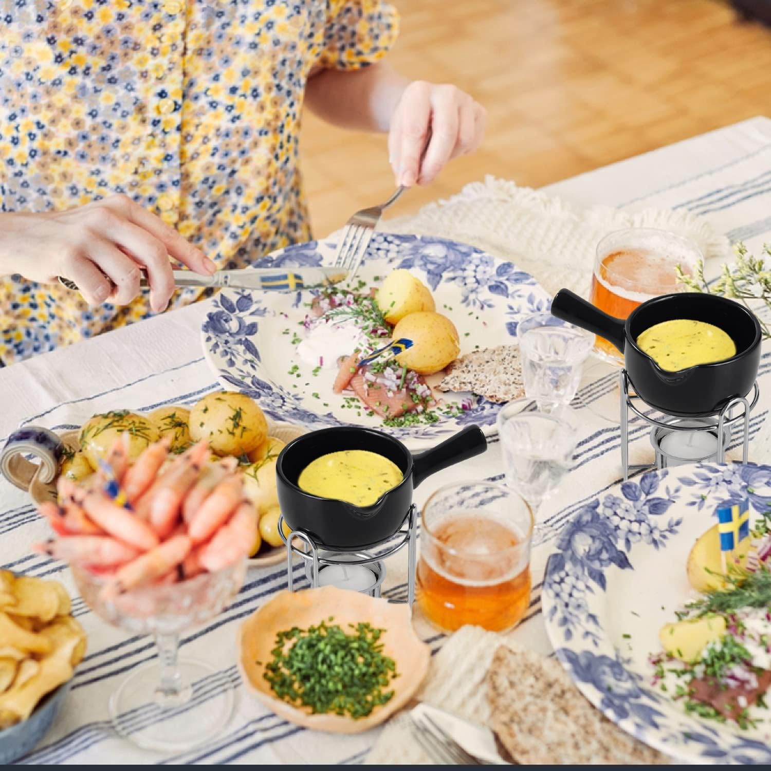 - ENHANCED STABILITY & OPTIMAL WARMTH - Butter warmers for seafood set of 4, feature a sturdy wire frame with a platform that securely holds the ceramic bowl in place, ensuring stability. This design offers enhanced stability compared to a top support ring for suspending the ceramic bowl. There has been an adjustment in the tea-light candle placement to ensure an optimal distance from the flame to the ceramic bowl, providing gentle warmth and maintaining the butter at just the right temperature. Indulging in dipping crab legs into warm butter!