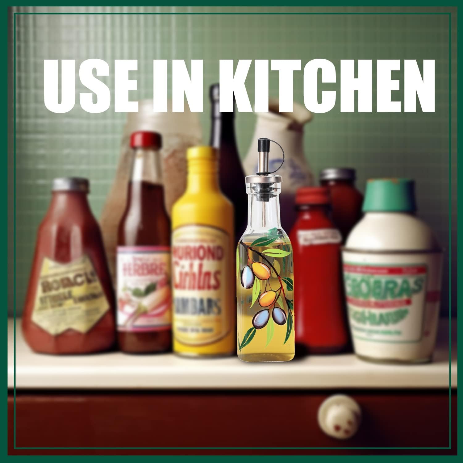 7oz Hand Painted Glass Olive Oil Bottle Dispenser - 200ml Green Oil & Vinegar Cruet with Pourers - Olive Oil Carafe Decanter for Kitchen