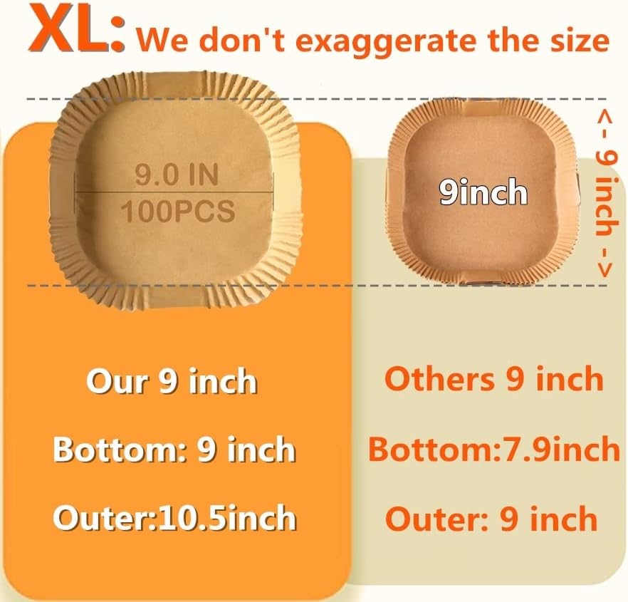 - 【Size and pakage 】 include 100PCS Large 9.0inch square paper liners .high quality air fryer parchment paper liners 9.0in*9.0in*1.77in,Fits 9.0''-10.5'' Air Fryers, due to manual measurement, there may be a deviation of 0.5-1 inch (approximately 1.3-2.5 cm), fit most air fryers.