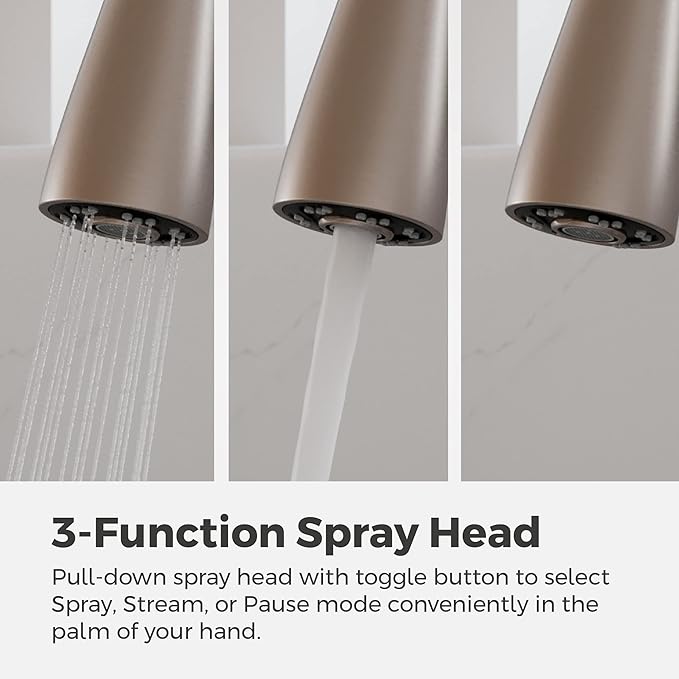 - PULL DOWN SPRAYER – Select from three water settings conveniently in the palm of your hand; wipe clean nozzles allows you to wipe away mineral deposits with the swipe of a finger