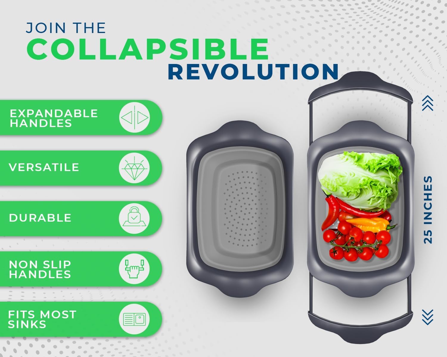 XL Large Kitchen Strainer by Comfify - Collapsible Silicone Over-The-Sink Colander with Extendable Handles - Use with Pasta, Fruit, Berries & Veggie - 6 Quart - Gray
