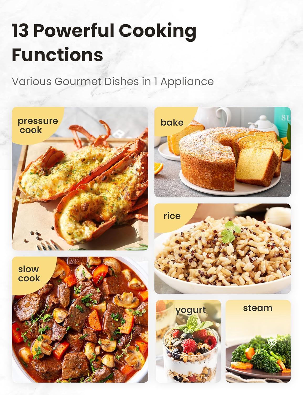 - 13 PRESETS SATISFY ALL YOUR COOKING NEED: This versatile pressure cooker has 13 programmable preset functions, allows you to cook various gourmet dishes like meat, broth, bean, oatmeal, etc. with just a few steps