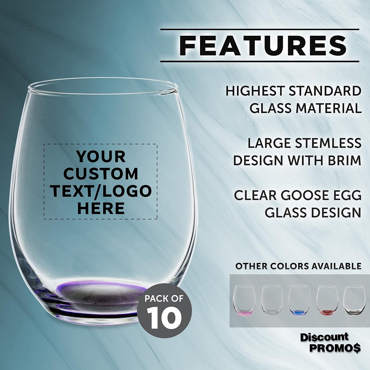 Custom Stemless Wine Glasses in Bulk by ARC Perfection, 15 oz, 10 pack, Personalized Text, Logo, Purple or White Wine Glass Set, Purple