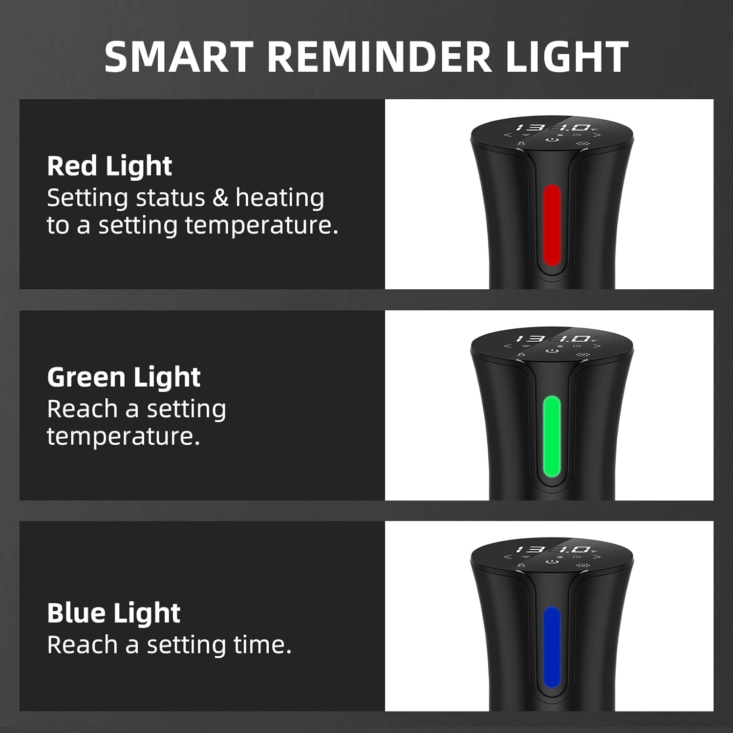 - Precision Cooker: Rocyis precision sous vide cooker that features a countdown timer (0:01-99:59 hours) and a 0.1°C precise temperature sensor (from 77°F - 198.5°F). LED touch panel or App controls make cooking more precise and convenient.