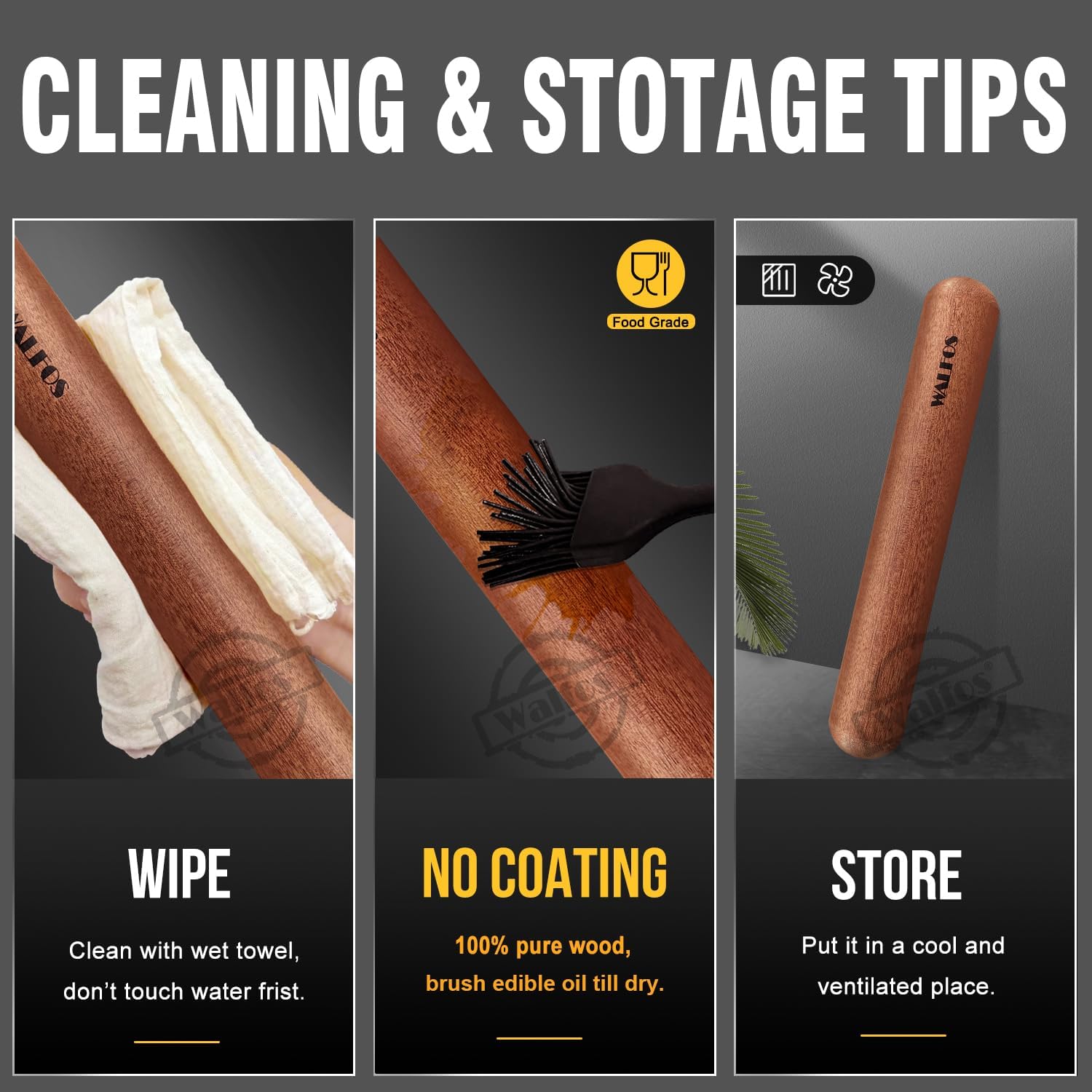 - 【EASY CLEANING & STORING】 - Natural non-stick wood pizza rolling pin, you just need a towel to wipe it and brush edible oil till dry, store it in a cool and ventilated place to avoid mould. Note: Do not place in dishwasher or soak in water.