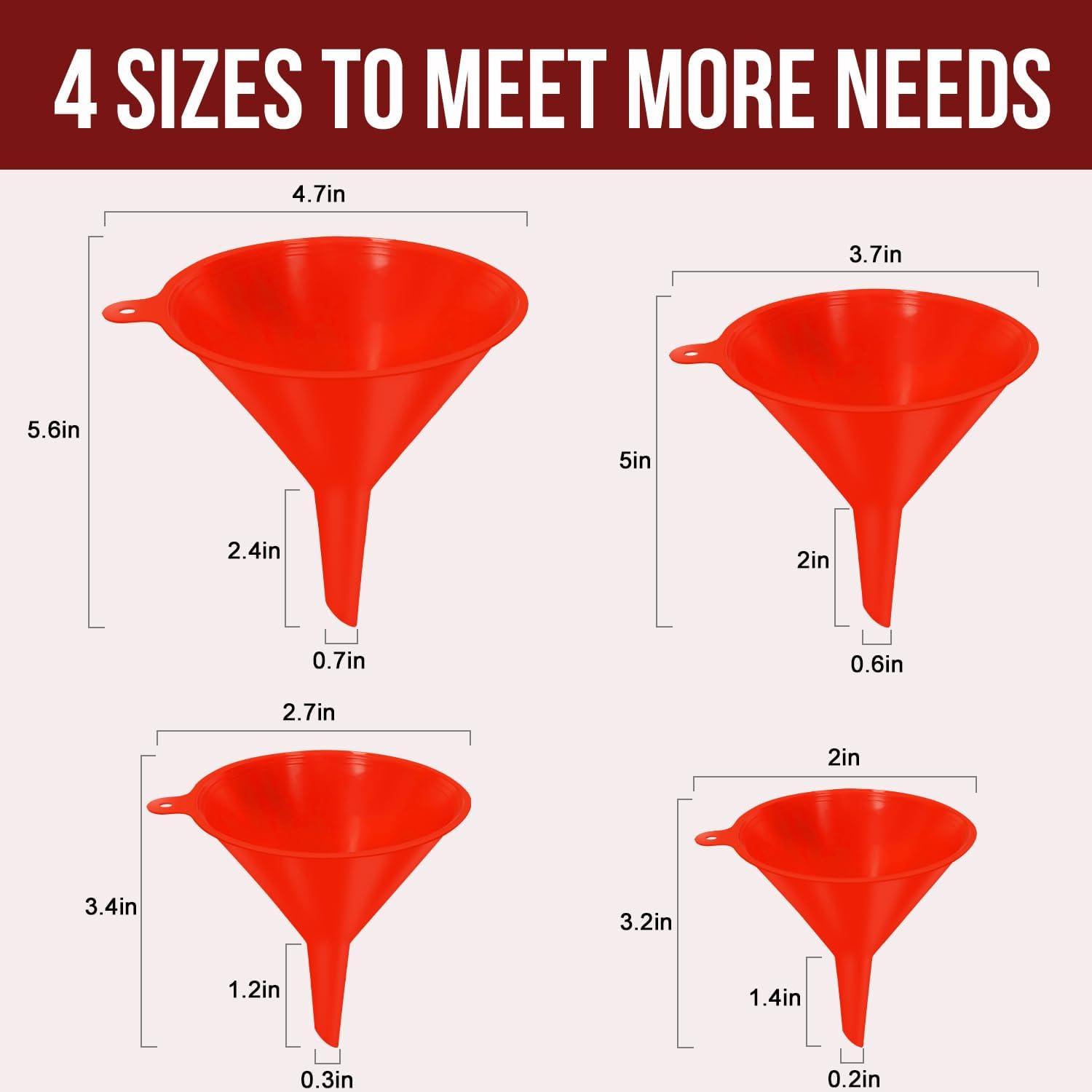 - 【Multi-size & multi-purpose】: 4 plastic funnels (4.7"、3.7"、2.7”、2")of different sizes to pour liquids, essential oils, fragrances and even powders into bottles, containers and jars of various sizes for use in places such as car care, cleaning, restaurants, schools and laboratories