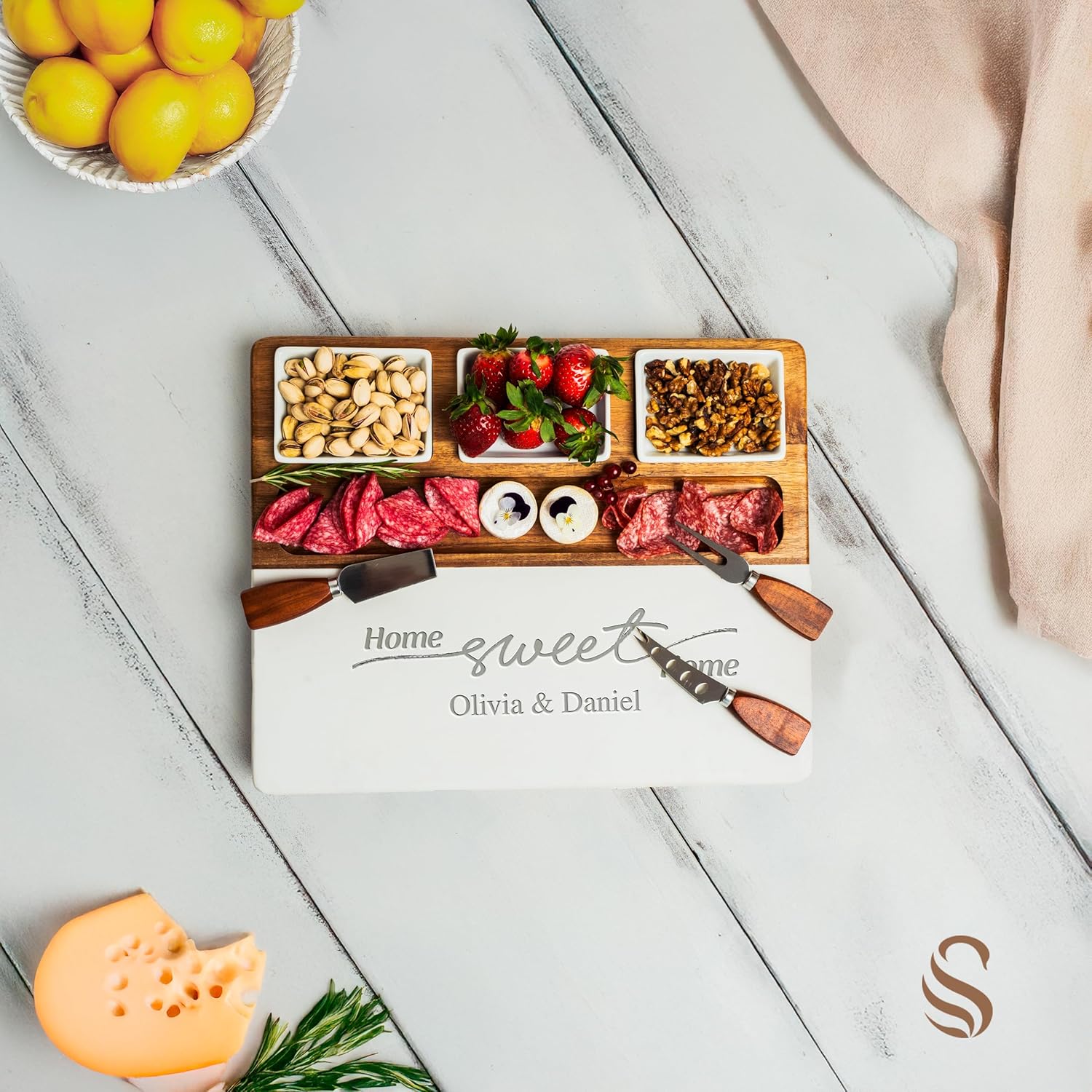 Shanik Wood - Marble Cheese Board Set with 3 Ceramic Bowls - Stainless Steel Cutlery Set, Charcuterie Board & Gift for Any Occasion (with Engraving)