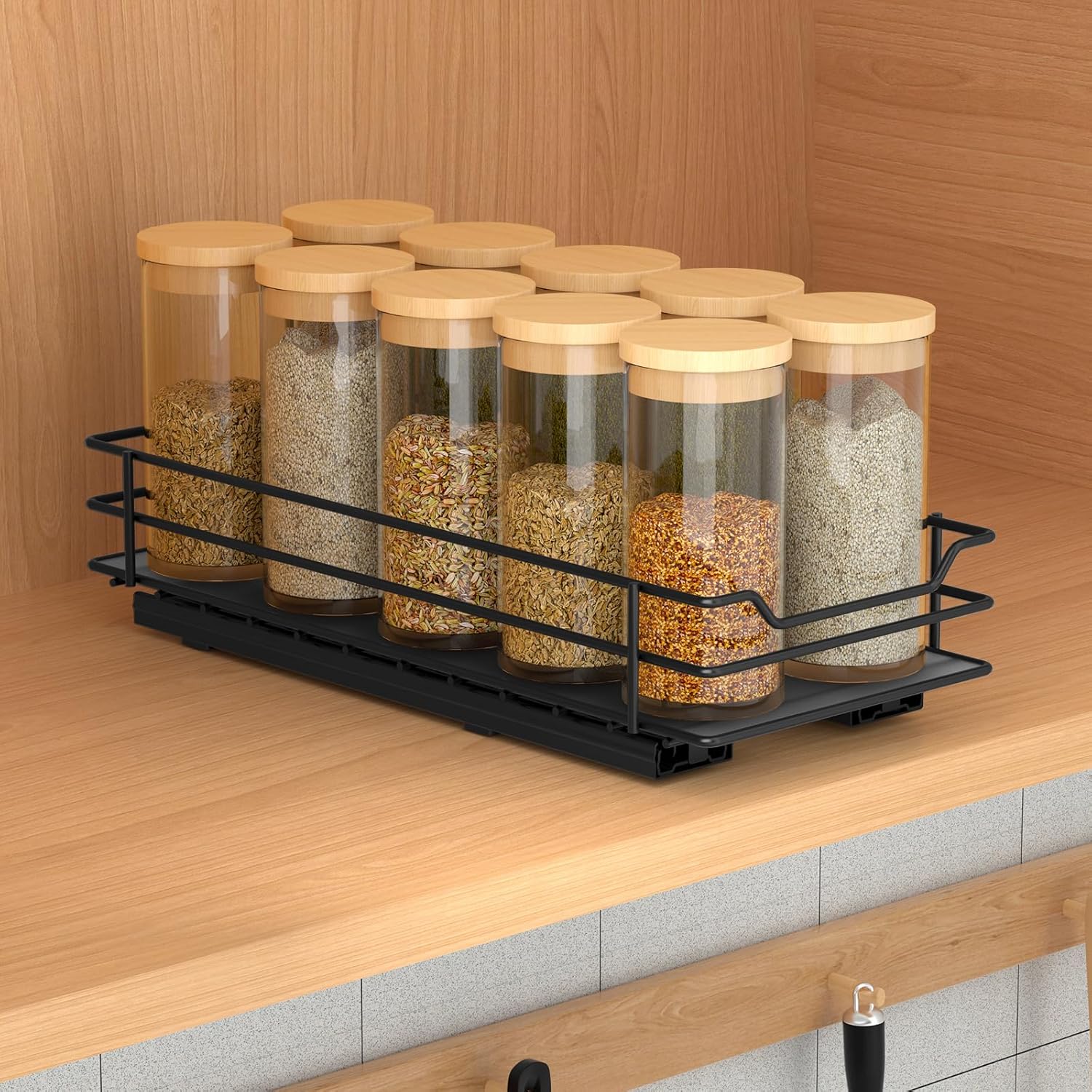 - More Storage Spice and Organized Spices: This vertical spice rack pull out holds up to 10 standard spice jars, allows you to store more spices in less cabinet space and save space. Pull-out spice rack organizer fits into cabinets so your spices can be neatly arranged, cabinets are no longer cluttered, and spices are easily accessible when used.