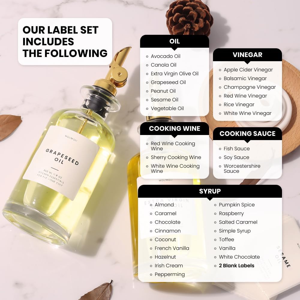 - Modern Kitchen Essential: Minimalism Inspired Cooking Oil Dispenser Bottle. This Set Includes Two High-quality 11.8 Oz (350 Ml) Glass Bottles, Two Gold Pourers, a funnel, and a 37 Label Set.