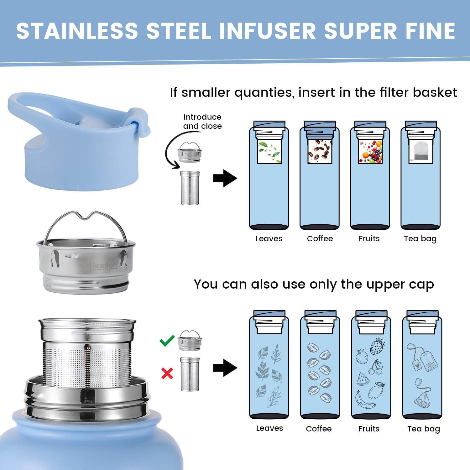 - ✅ LIDS & INFUSER/STRAINER- Lexlion water bottle 32 oz comes W/3 LIDS! a spout lid, a flip lid & and a third lid which is straw lid, 100% leak-proof & dishwasher safe. It includes a newly designed 2-piece strainer stainless steel, a very convenient filter to make loose tea leaves, cold coffee brews, herbs, or fruit-infused water. Add them to the filter basket, close it & clip in the tea water bottle infuser with water. If an infuser is not needed, just remove it.