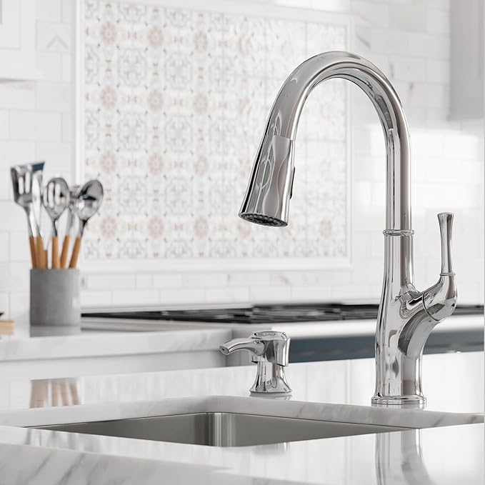 - KITCHEN FAUCET WITH PULL DOWN SPRAYER – Advanced spray head docking system; elegant forward handle design underscores ergonomic function and helps where space behind the faucet is limited; includes coordinating soap dispenser and decorative deckplate