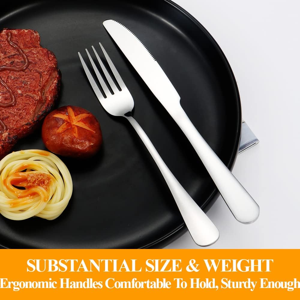 - ✅ PREMIUM MATERIAL, STURDY QUALITY, GREAT VALUE---This cutlery set is nicely made of premium FOOD GRADE stainless steel which is very Reusable, rust-resistant, corrosion resistant, BPA free, non toxic, no metal aftertaste and not bend/break easily. Stainless flatware can endure the high temperatures in the dishwasher, you can expect this set to last for years to come.