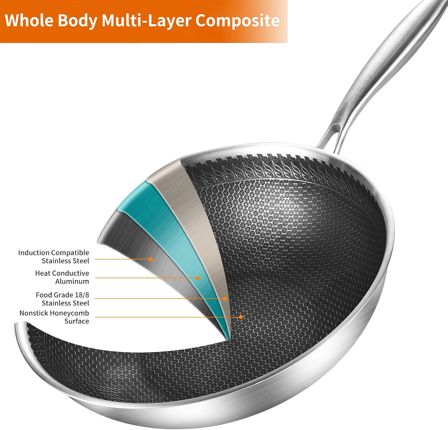 - 【HEALTHY MATERIAL】DELARLO 5QT Wok Pan with lids are made up of Triply Stainless Steel, 18/8 Cooking Surface, which is highly durable, corrosion-resistant, and does not react with food to ensure healthy cooking.