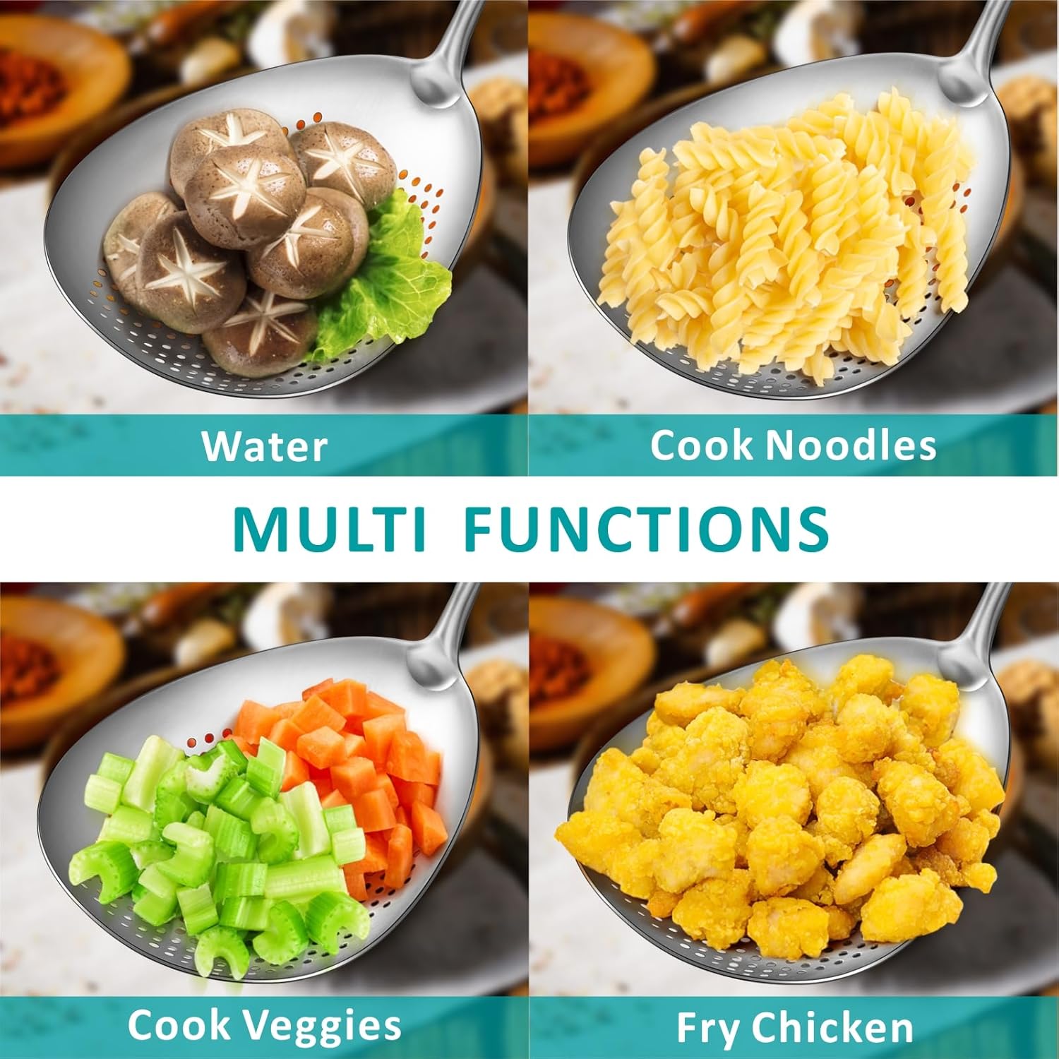 - EXTRA DEEP SKIMMER SPOON BOWL - Width of the bowl is 5.8 inches and depth is 1.5 inches.The extra-deep strainer bowl helps you quickly scoop out a large amount of food in seconds.If you search for a multifunctional cooking&frying&drainig kitchen utensil for family dinner party gathering at home or in restaurants,this slotted skimmer spoon would be the best.
