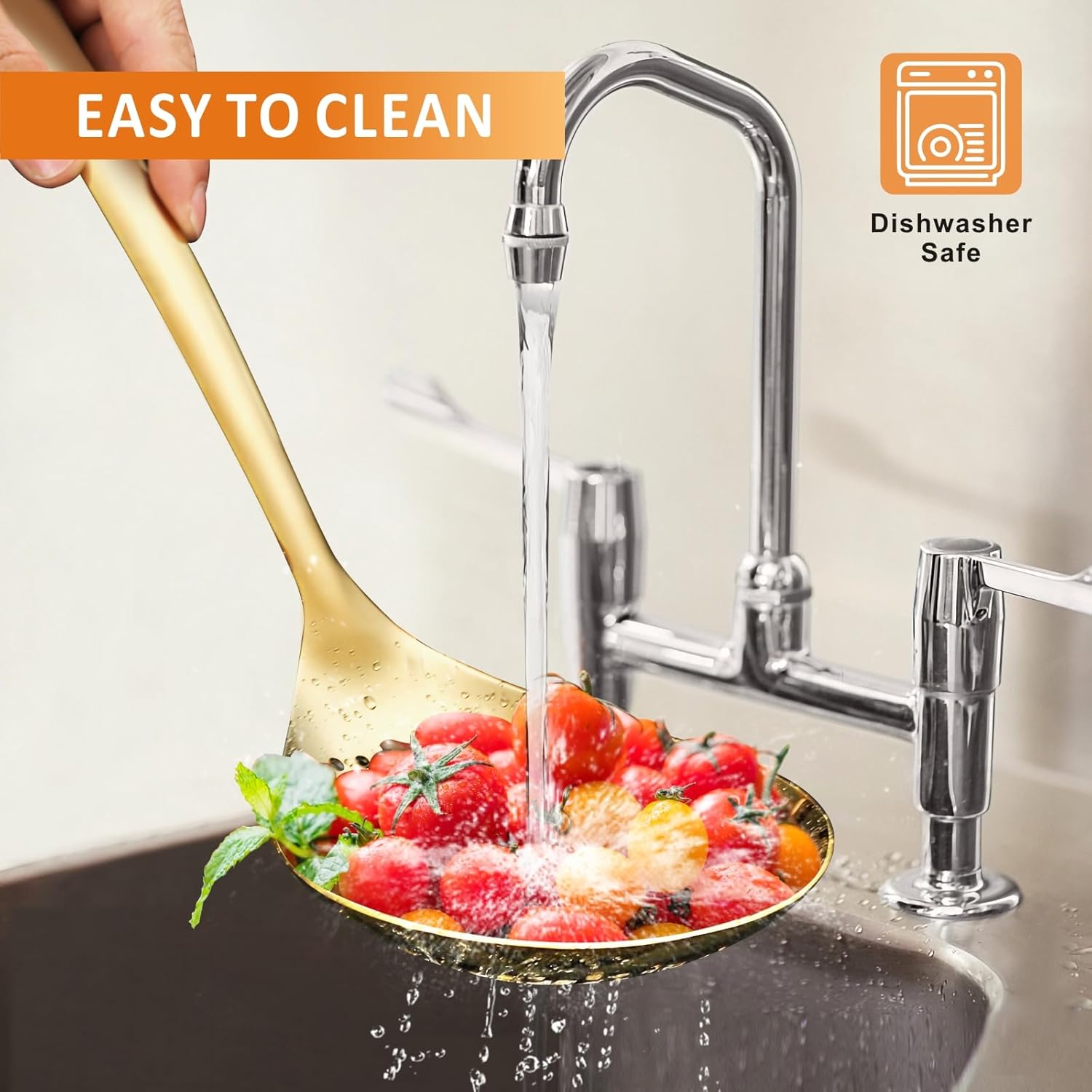 - DURABLE 304 STAINLESS STEEL - Whole skimmer ladle is made of strong 304 stainless steel material which is food safety, heat resistant, rustproof and durable. No worry about deform or rusty after long-term use. Ergonomic handle designed helps to hold food firmly and rest comfortably in your hand when deep frying or cooking.