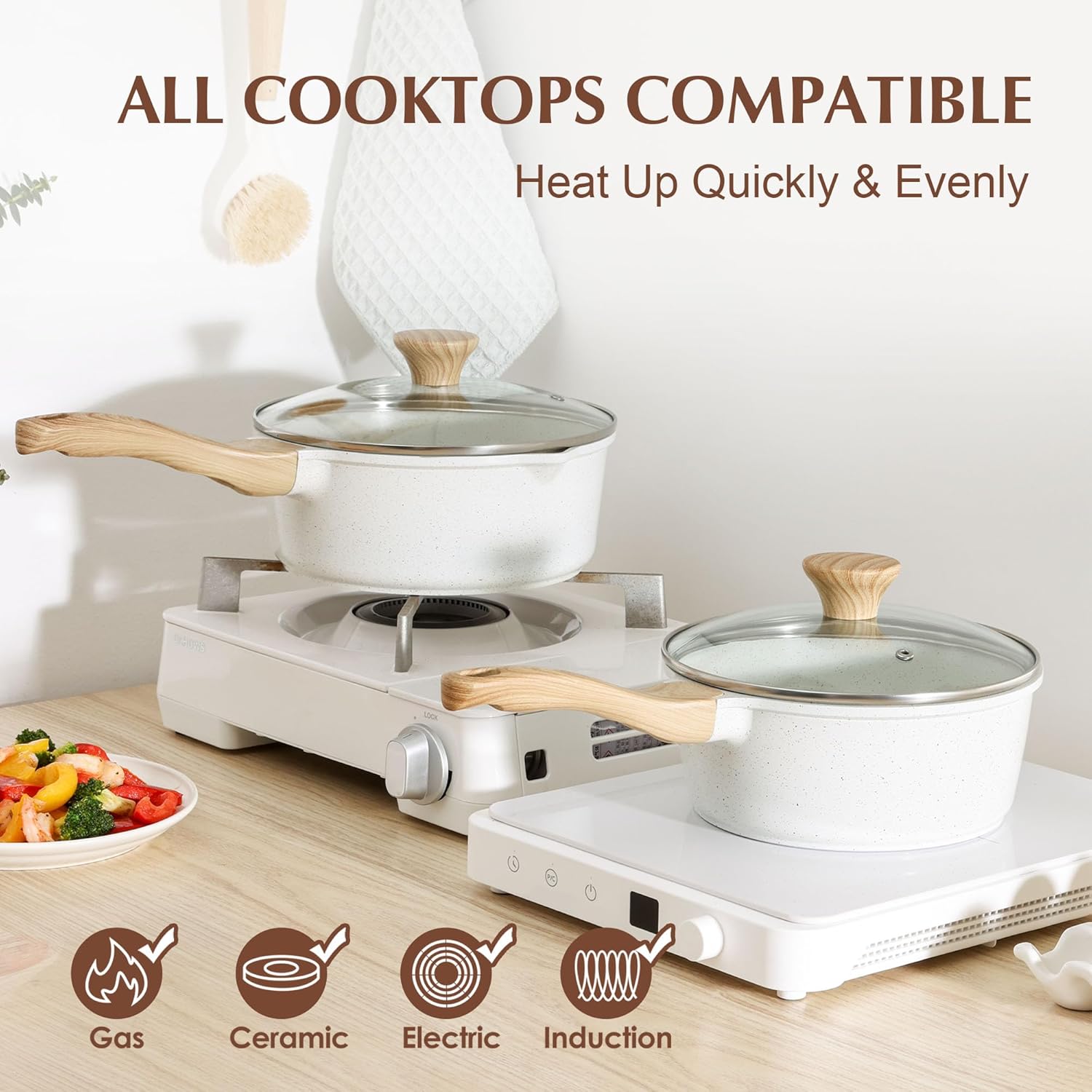 SENSARTE White Ceramic Nonstick Saucepan with Lid Set, Small Cooking Pot with Stay Cool Handle, Induction Compatible Saucepot, White Granite Coating, PFOA/PFAS Free, 1.5 + 2.5QT