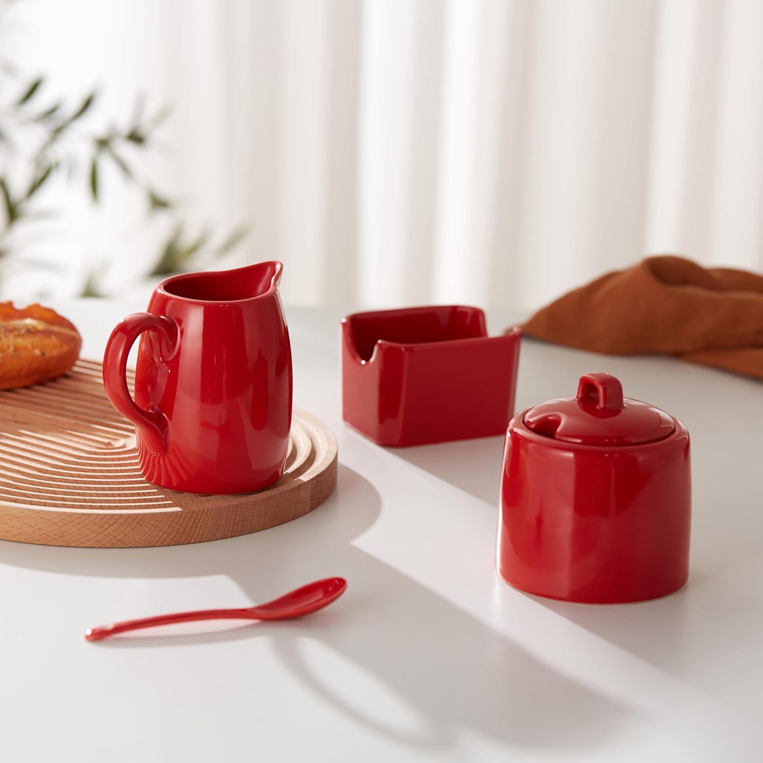 Kook Sugar and Creamer Set, 3 Piece, Pitcher, Sugar Bowl with Lid and Spoon, Sweetener Holder (Red)