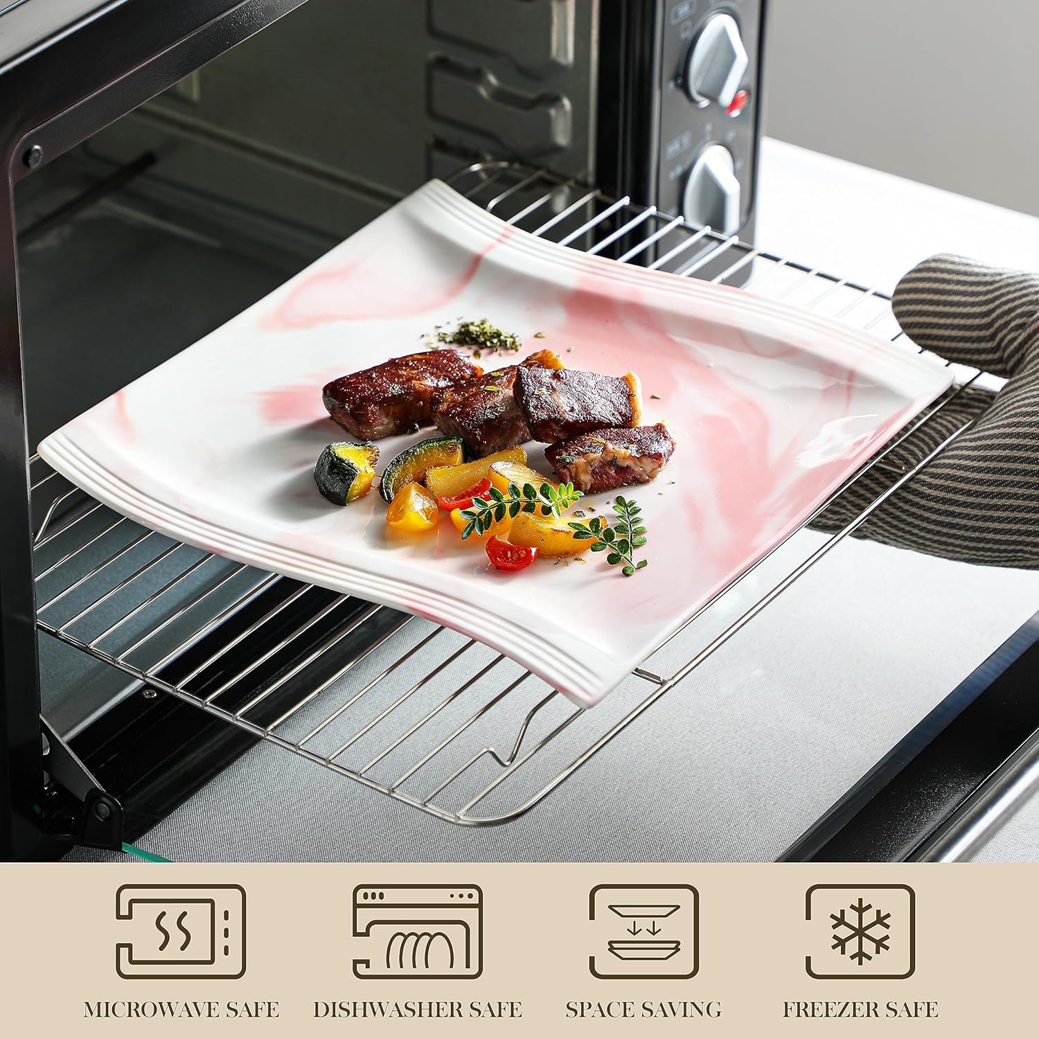 - Stylish & Low Maintenance -- Featured with low-profile wavy-shaped square design, each pink plates and bowls set are distinct; The pink dinnerware sets are designed to provide the best dining experience while requesting low maintenance, saves you time and effort in upkeep.