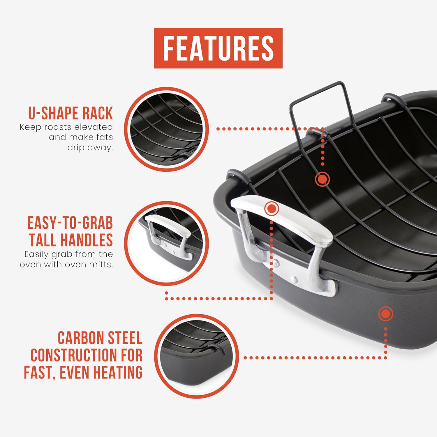 - ✅ ROAST LIKE A PRO: Elevate your kitchen game with this deluxe extra large 18.5 x 14.5-in (47 x 37 cm) roasting pan. The height boasts a tall deep pan of 3-in (7.5cm) (5.9" (15 cm) with handle). Designed for family gatherings and large meals, this pan and its complementary U-rack offer enough space for your turkeys, roasts, and barbecue delights.