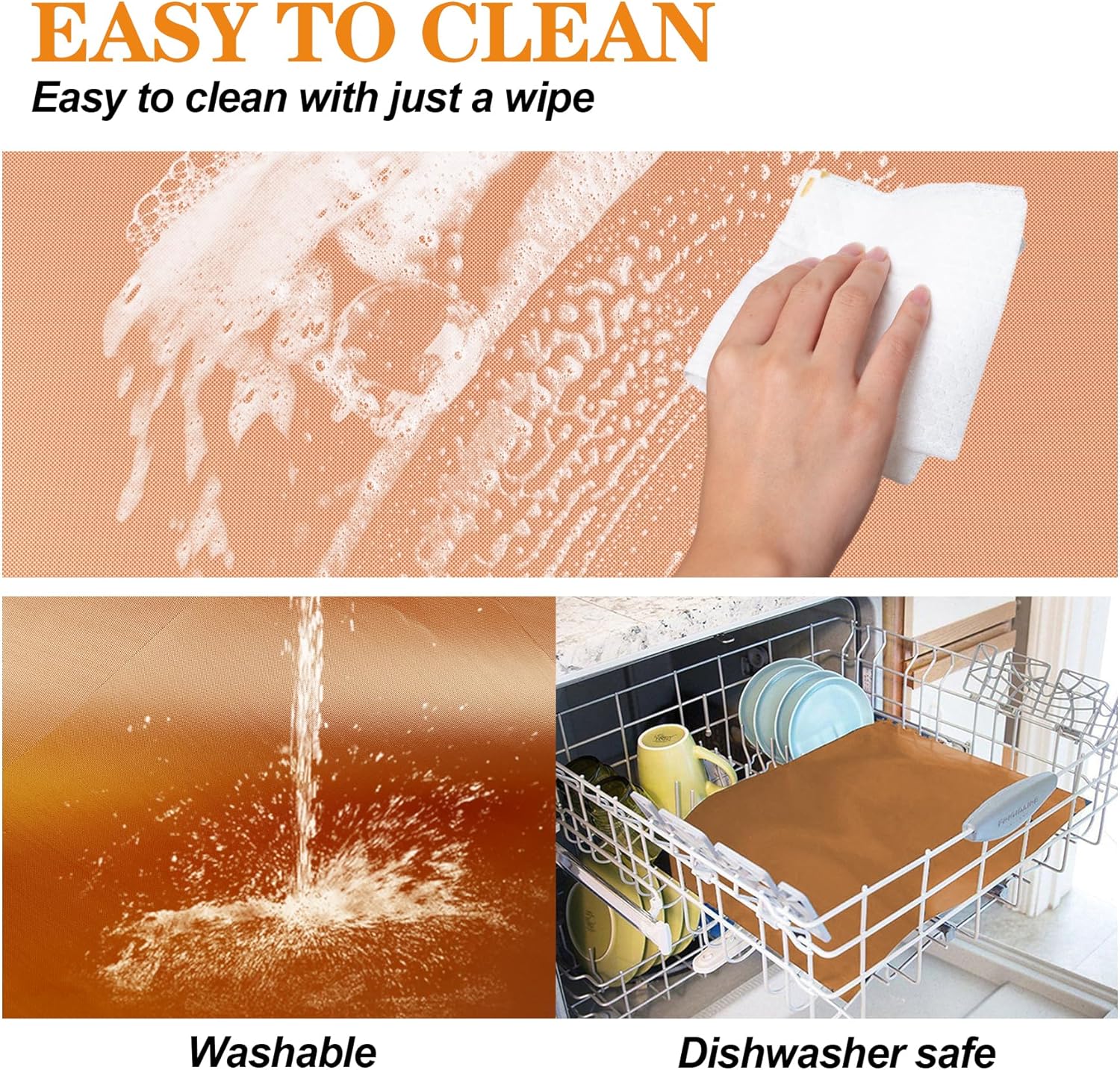 - Keep your oven spotlessly clean with our non-stick copper oven liners! They catch drips, cheese, sauces, and other baked messes, making cleaning a breeze. Plus, you can wash them in the dishwasher for easy maintenance