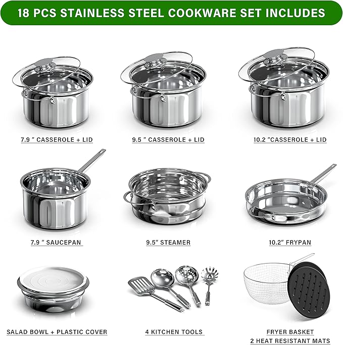 18-Piece Stainless Steel Kitchen Cookware Set, Including Saucepan, Casseroles with Tempered Glass Lid, Frypan, Steamer, Salad Bowl with Cover, Fryer Basket, Heat Resistant Mat & Utensils Set, Silver