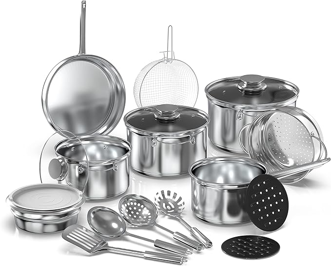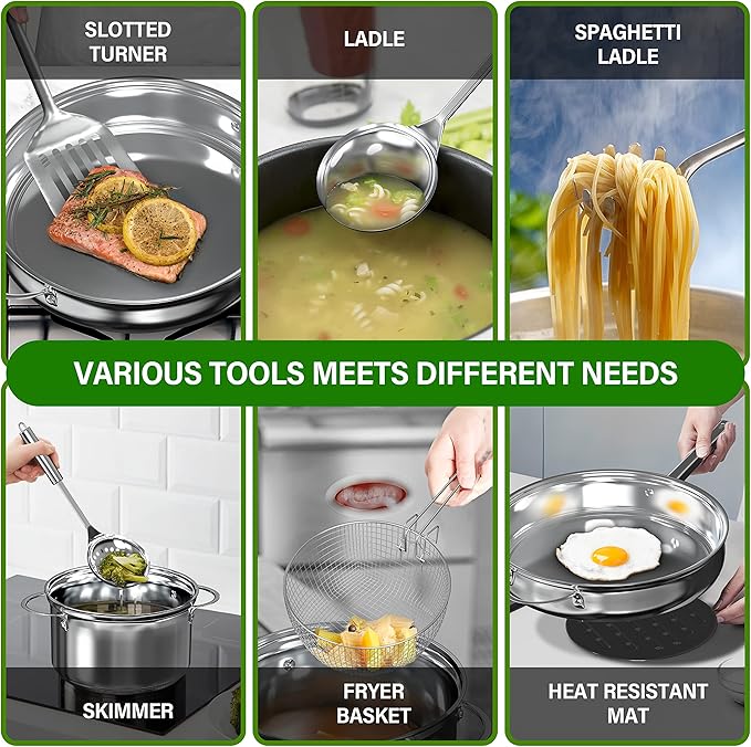 - Stainless Cookware Set: Include 3 casserole (7.9”/9.5”/10.2”), 7.9” Saucepan, 10.2” frypan, 1 x steamer, 1 x basket, 1 x salad bowl with cover, 4 x kitchen tools (skimmer, spaghetti ladle, slotted turner)