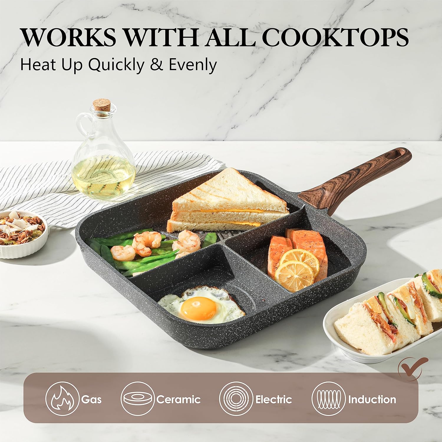 - 3-in-1 Design - 3 section square grill pan can cook 3 different foods at the same time, and these dividers prevent food from mixing. One pan is comparable to three pans, perfect for making sandwiches, bacon, steaks, burgers, wings, sausages, pancakes and more.