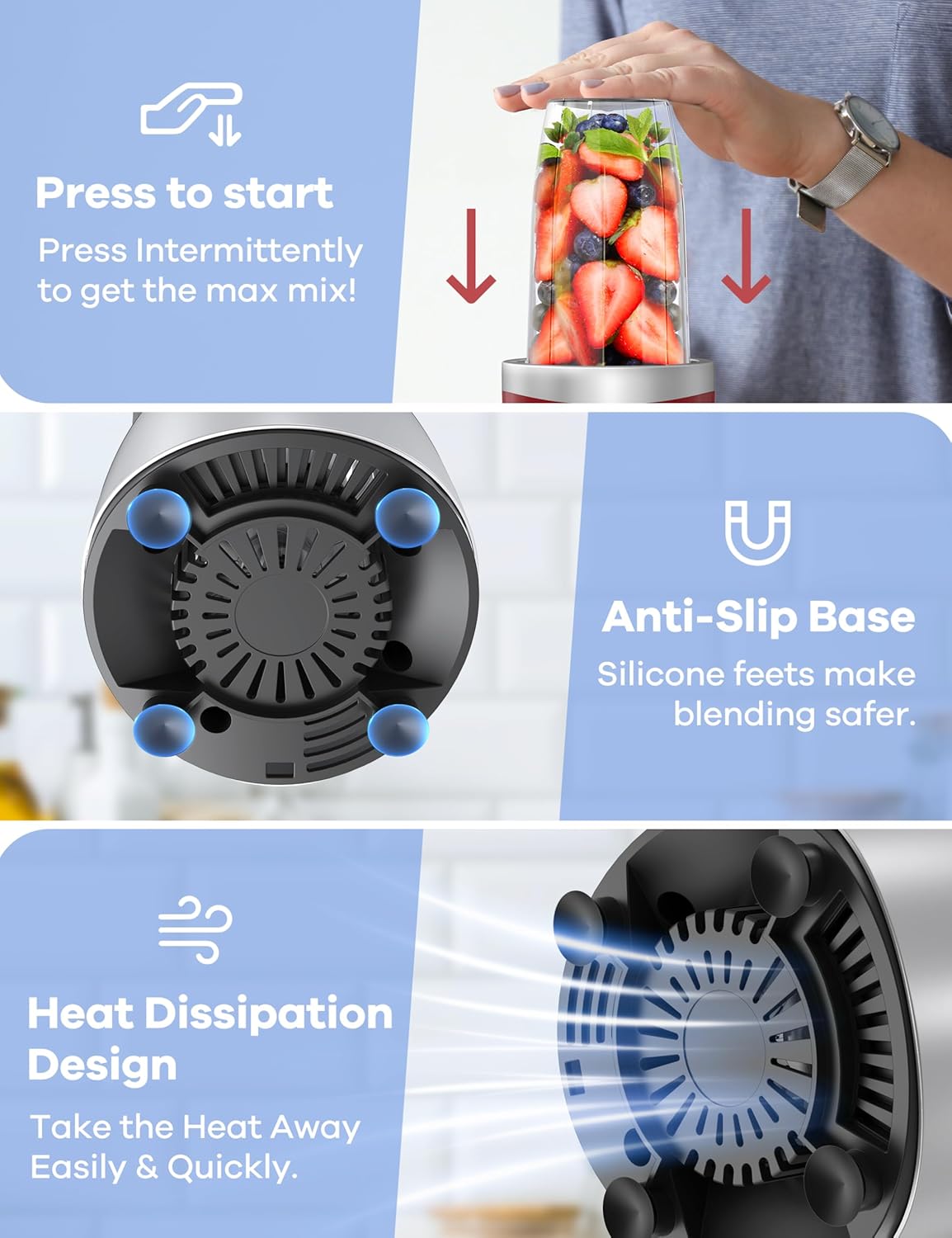- 【Safety First】Your safety is our top priority, Blender for smoothies only works when the blender cup is properly locked into the base. cooling fan on the bottom of the blender for quick heat dissipation. 4 Non-slip silicon pads can keep balance when the smoothies blender is working.