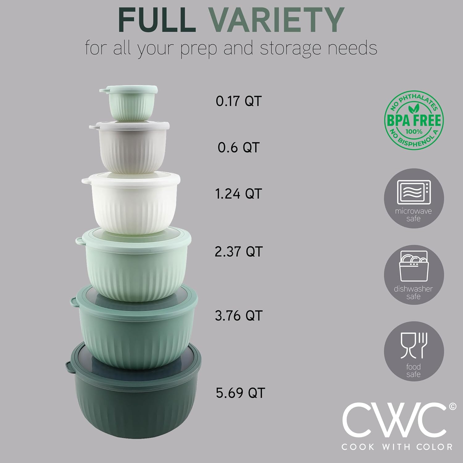 - Set Includes the great combination of small and medium size bowls: The sizes of our bowls are: .17 qt, .6 qt, 1.24 qt, 2.37 qt, 3.76 qt, 5.69 qt bowls with lids. A size for all your kitchen needs.